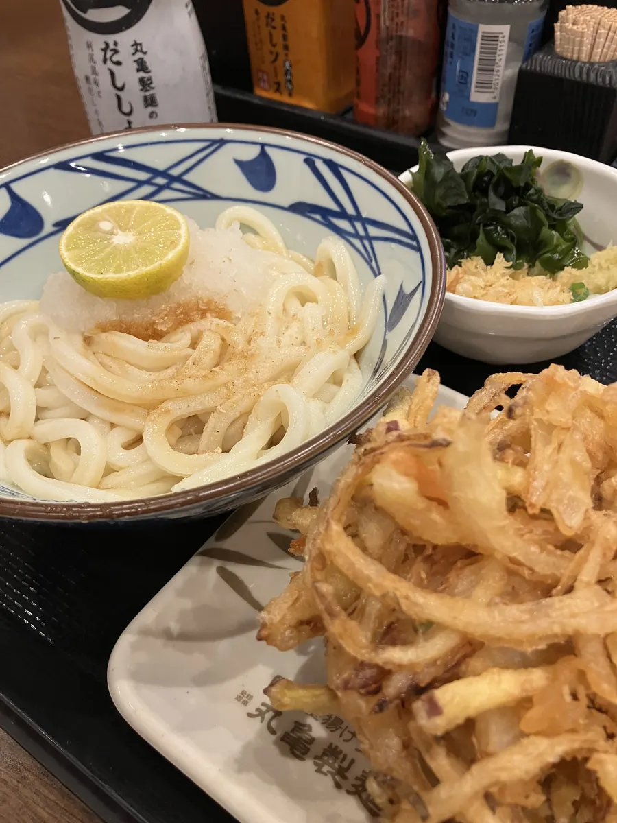 天麩羅探索なので、できるだけ違うものを選び(アプリクーポン使用の野菜かき揚げ)うどんは『冷かけ』が姿を消して贔屓を決めないとしたものの、おろし&すだちに拘り、前回(15日)と同じものに(おろし醤油うどん)