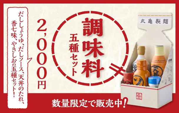 丸亀製麺で実際に使用しているこだわりの「調味料五種セット」が、数量限定で販売開始!🧂🌶️