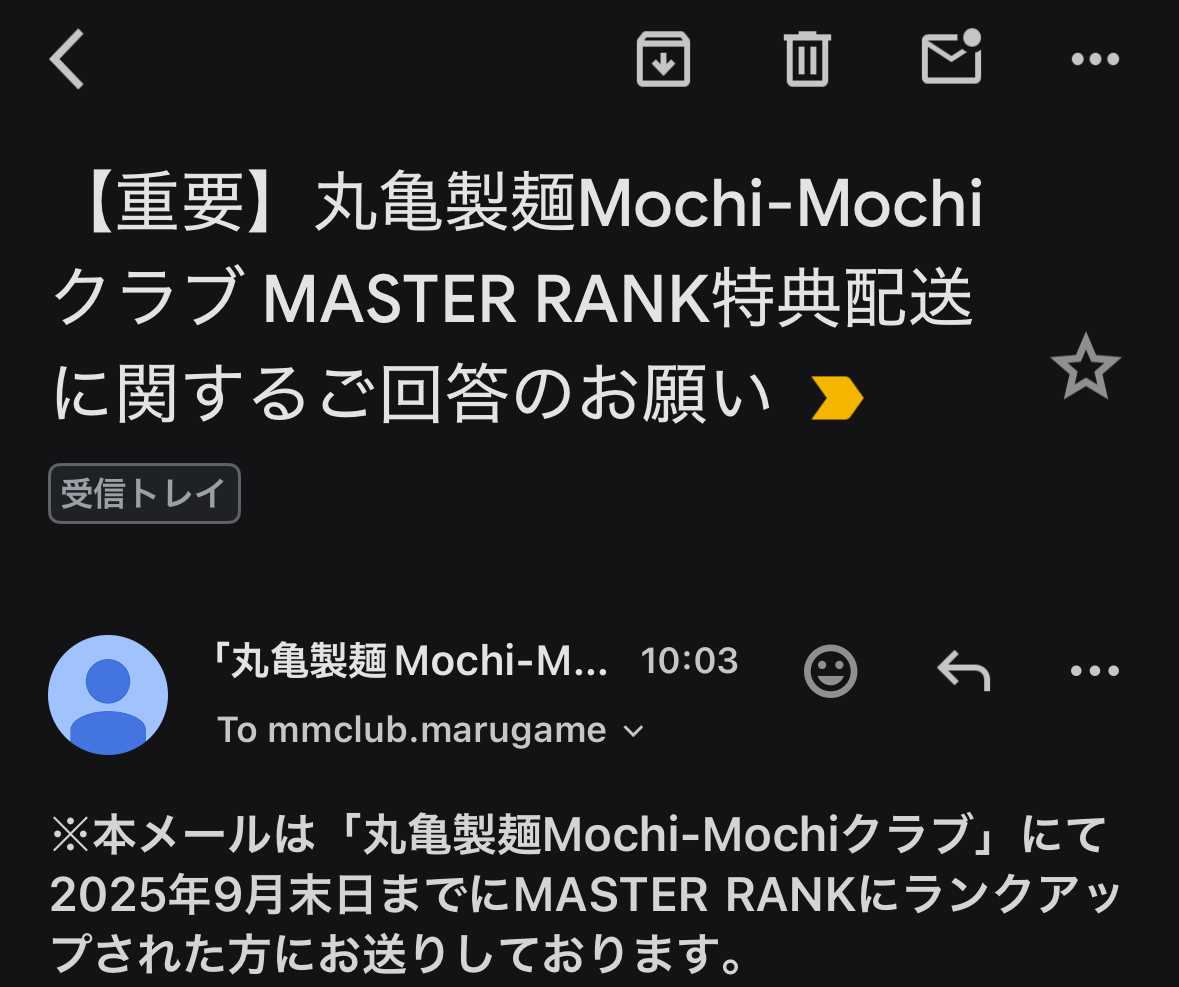 トップ > MARUGAMEgram > みんなのなんでも写真館 > 嬉しいメール✉️ おこめ 2025/10/16 22:50 嬉しいメール✉️ MASTER RANK記念トロフィーのメールが届きました! 速攻回答しました!笑 トロフィー早く届かないかな〜 いいね 共有する 共有する X LINE リンクをコピー コメントする 7 件の返信 (新着順) ミュートしたユーザーの投稿です。 投稿を表示 からあげ 2025/10/18 00:20 わたしもはやくきてほしいですー!! いいね 返信する ミュートしたユーザーの投稿です。 投稿を表示 もこもこむう 2025/10/17 18:43 ワクワク😃💕 待ち通しいですね😆 いいね 返信する ミュートしたユーザーの投稿です。 投稿を表示 おこめ 2025/10/18 00:05 もこもこむう 待ち遠しいです、早く欲しいです☺️ いいね 返信する ミュートしたユーザーの投稿です。 投稿を表示 でめさん 2025/10/17 08:40 待つまでの時間が楽しいですね😊🎶 いいね 返信する ミュートしたユーザーの投稿です。 投稿を表示 おこめ 2025/10/18 00:05 でめさん 楽しみに待ちたいと思います! いいね 返信する ミュートしたユーザーの投稿です。 投稿を表示 武蔵 2025/10/17 06:34 届くまで時間がかかりますので何処に飾るか考える時間ですよ🏆 いいね 返信する ミュートしたユーザーの投稿です。 投稿を表示 おこめ 2025/10/18 00:04 武蔵 じっくり考えて待ちます😆 いいね 返信する ミュートしたユーザーの投稿です。 投稿を表示 武蔵 2025/10/18 07:42 おこめ 私はお相撲さんのサインの横(横綱大の里さんではないですが)の横に飾りました😅 いいね 返信する ミュートしたユーザーの投稿です。 投稿を表示 かけちゃん 2025/10/17 06:07 自分も昨日メール来てました📩楽しみですね😊 いいね 返信する ミュートしたユーザーの投稿です。 投稿を表示 おこめ 2025/10/18 00:04 かけちゃん 同じく9月にランクアップされたんですね!おめでとうございます👏🏻 届くの楽しみですね〜 いいね 返信する ミュートしたユーザーの投稿です。 投稿を表示 かけちゃん 2025/10/18 07:45 おこめ お互いに次を目指してまったり頑張りましょう😊 いいね 返信する ミュートしたユーザーの投稿です。 投稿を表示 T.K 2025/10/17 00:46 楽しみですね😄 いいね 返信する ミュートしたユーザーの投稿です。 投稿を表示 おこめ 2025/10/18 00:03 T.K 楽しみです😊 いいね 返信する ミュートしたユーザーの投稿です。 投稿を表示 からあげ 2025/10/17 00:08 楽しみですねー!!🎶 いいね 返信する ミュートしたユーザーの投稿です。 投稿を表示 おこめ 2025/10/18 00:03 からあげ 楽しみです♪ いいね 返信する
