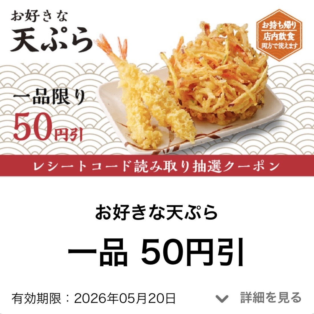 投稿を表示3連続で天ぷら50円引きクーポンは素晴らしい運です😁✨️