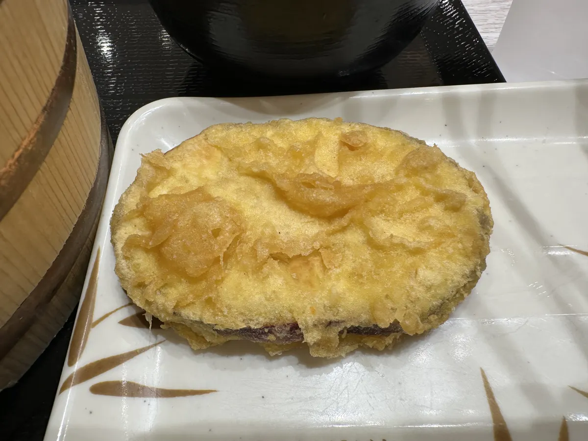 お供はさつまいも天ぷら、天ぷら50円引きクーポンで食べました。