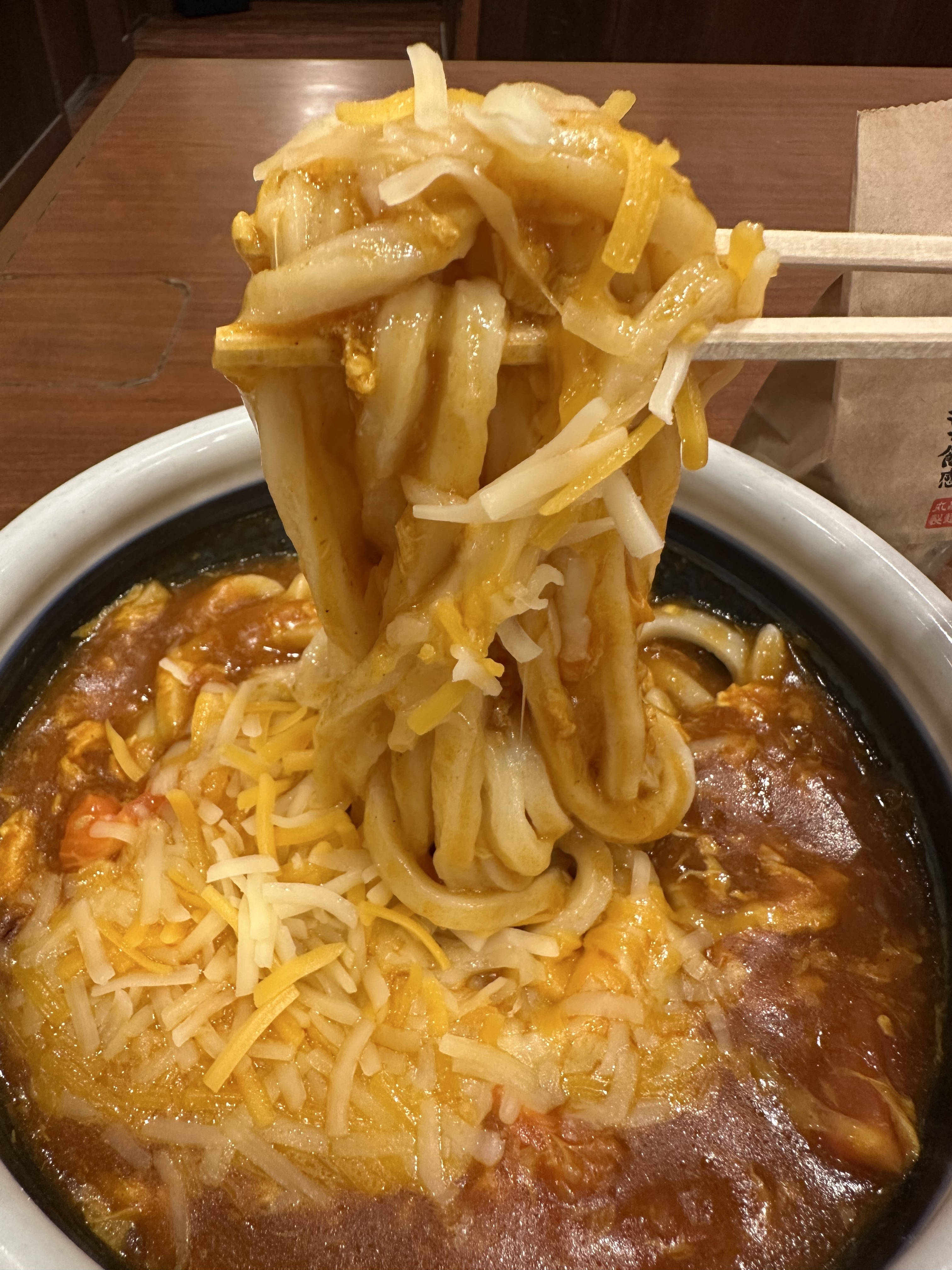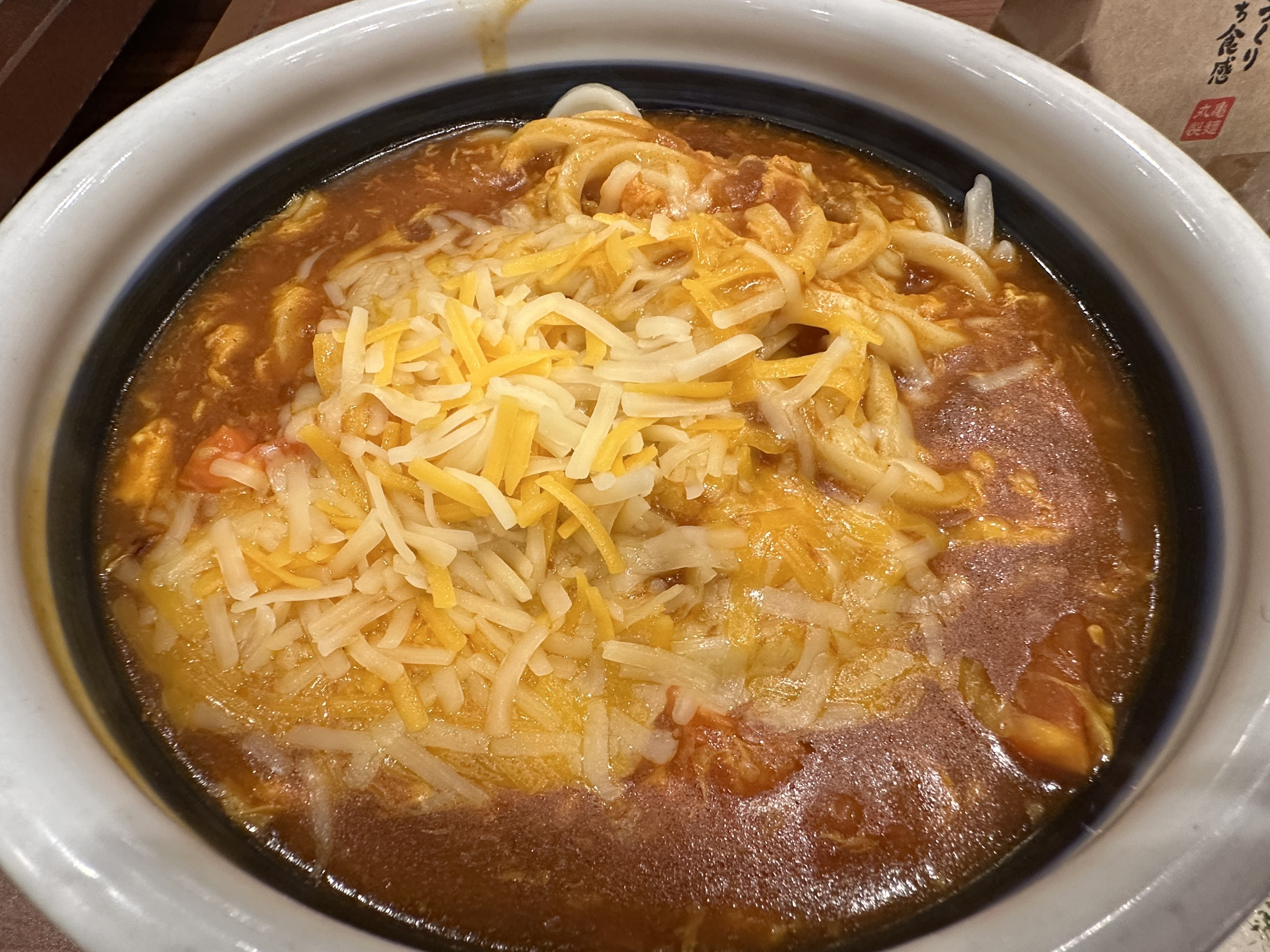 通常のトマたまカレーうどん、甘口は去年食べた事はあるので、今回は3種のチーズ入り(得)にしました😀