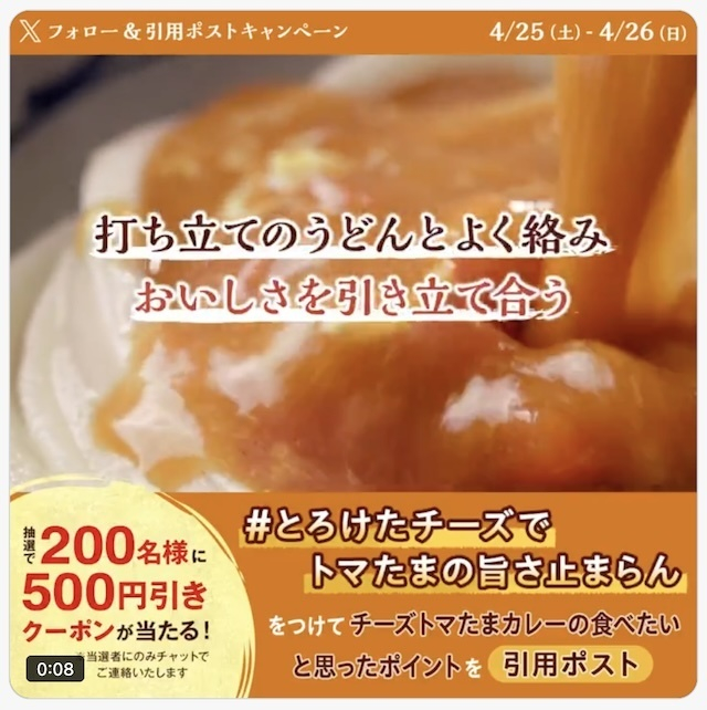 ②#今年もトマたまの旨さ止まらん をつけ、トマたまカレーうどんの食べたいと思ったポイントを書いて、該当の投稿を引用ポストします。