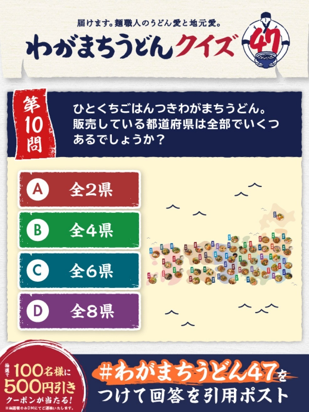 トップ > MARUGAMEgram > みんなのなんでも写真館 > わがまちうどん47 クイズ 最終日 cosmepico 2025/11/08 17:04 わがまちうどん47 クイズ 最終日 Xの公式アカウントに、「わがまちうどん47 クイズ 」の10問目が出題されています。きょうが最終日です。 わがまちうどん47 に使える500円引クーポンが抽選で100名様に当たるそうです。 10問目は、ひと口ごはんがついたわがまちうどんを販売している県は何県あるかという問題です。 いいね 共有する 共有する X LINE リンクをコピー コメントする 1 件の返信 (新着順) ミュートしたユーザーの投稿です。 投稿を表示 武蔵 2025/11/08 17:33 終わり良ければ全て良し で最後に当たってほしいですね🎯 いいね 返信する