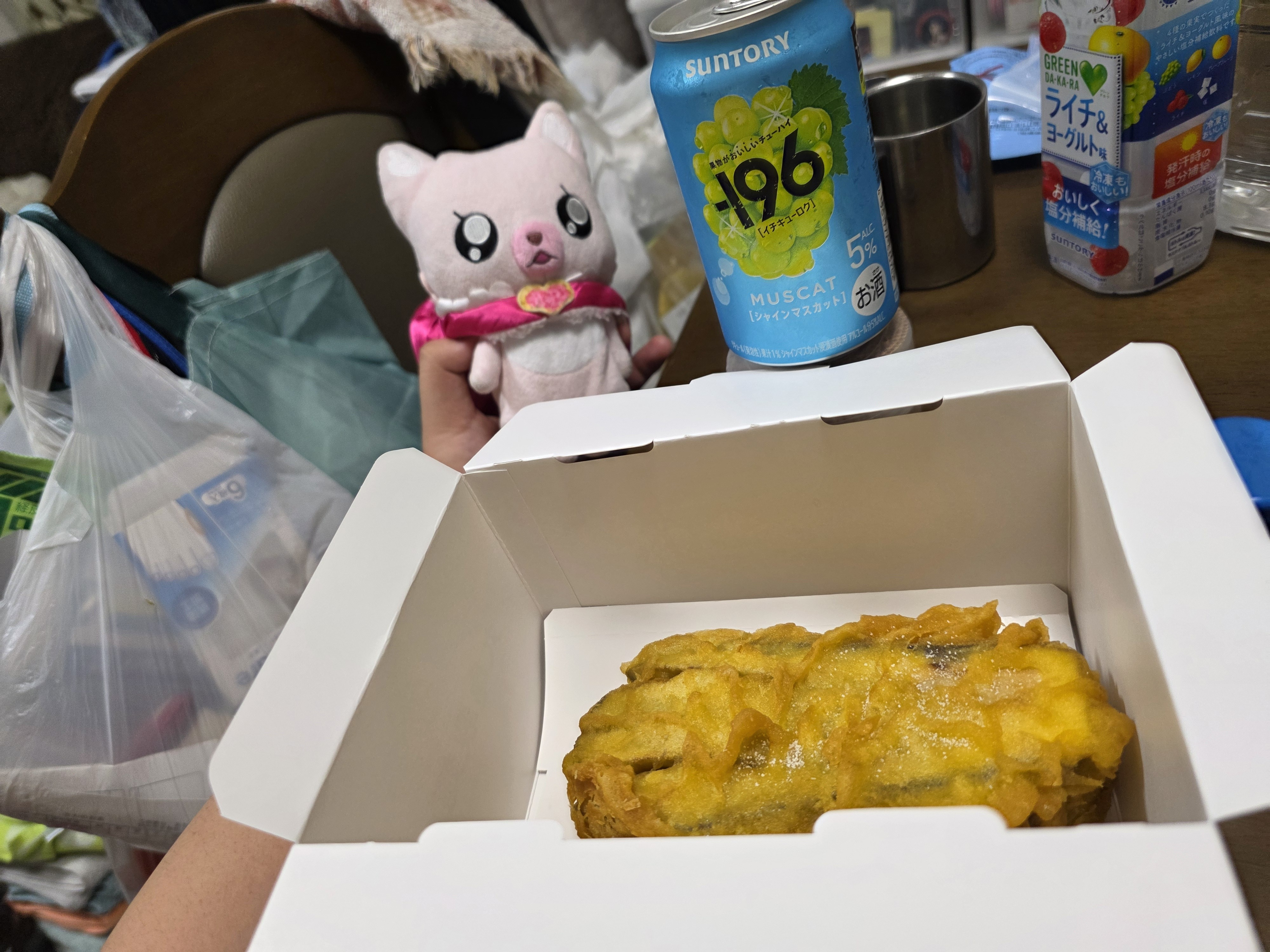 見えづらい角度ですが、長なす天とジャンボオクラ天を1軒目のときに見つけたので持ち帰りました!
