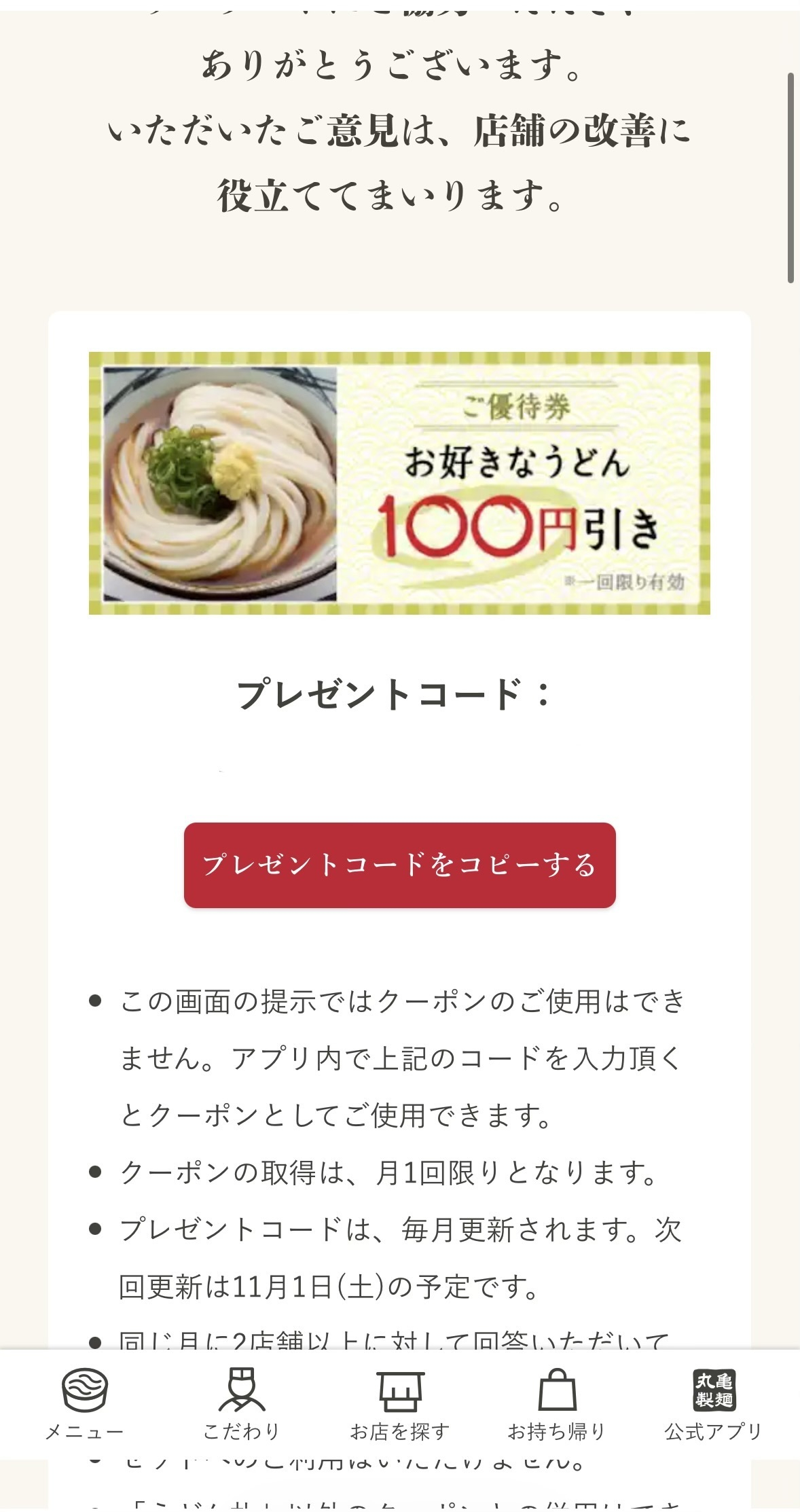 トップ > MARUGAMEgram > 100円引き! からあげ 2025/10/12 21:42 100円引き! アンケート答えたら100円引きクーポンが貰えるという情報をもちもちクラブでみたらまさかの貰えました!!🫶 知らなかったのでめっちゃ損してました😳 1日にもし使えたら80円でいけるのかなー?? ぜひみんなもしてみてください〜!! (クーポンは月イチらしい) コードは隠させていただきました^^ いいね 共有する 共有する X LINE リンクをコピー コメントする 2 件の返信 (新着順) ミュートしたユーザーの投稿です。 投稿を表示 T.K 2025/10/13 03:02 貰えるのは有難いですけど、月イチしか貰えない分、貰える回数増やしてほしいという、意見が少なくありません。。。🤔 いいね 返信する ミュートしたユーザーの投稿です。 投稿を表示 D 2025/10/12 22:55 ありがたいですね〜 いいね 返信する ミュートしたユーザーの投稿です。 投稿を表示 からあげ 2025/10/13 00:20 D もっと早くに気づけとけば、、 いいね 返信する
