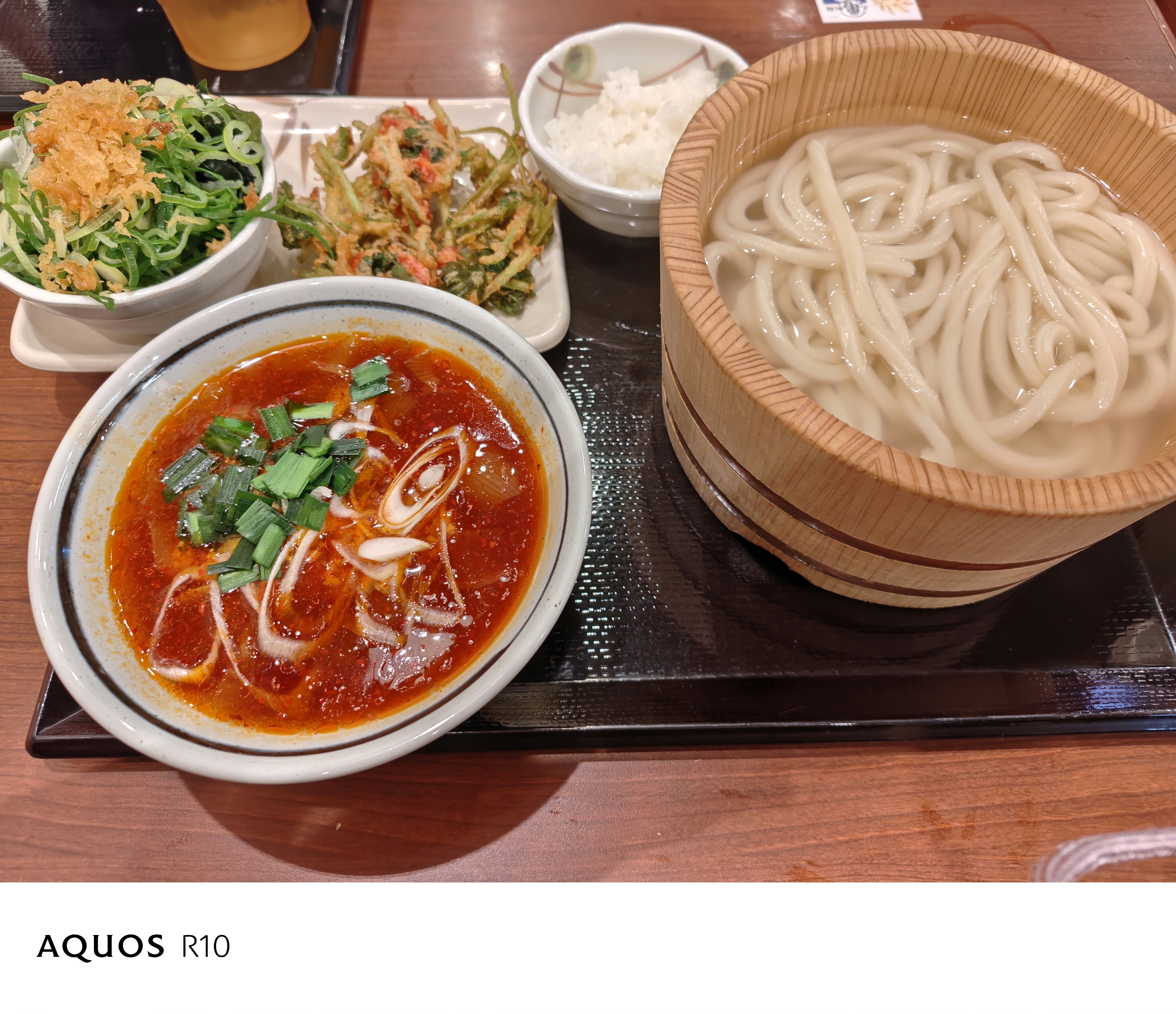 つけ汁は長ネギとニラが彩りを飾りラー油が表面を覆ってます。