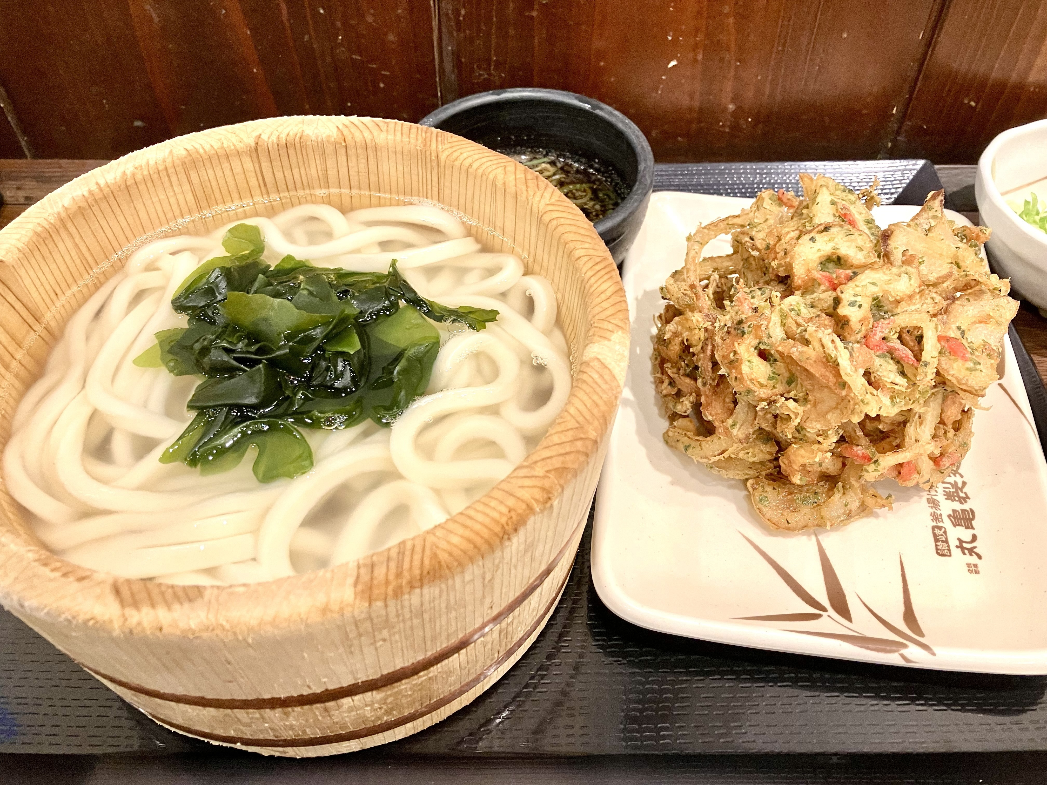 かき揚げ総選挙3位の『ちくわ磯辺紅しょうがかき揚げ』があり、まだ食べていなかったため、チョイス🙋♀️合わせるうどんはワカメしゃぶしゃぶを味わいたかったので釜揚げに