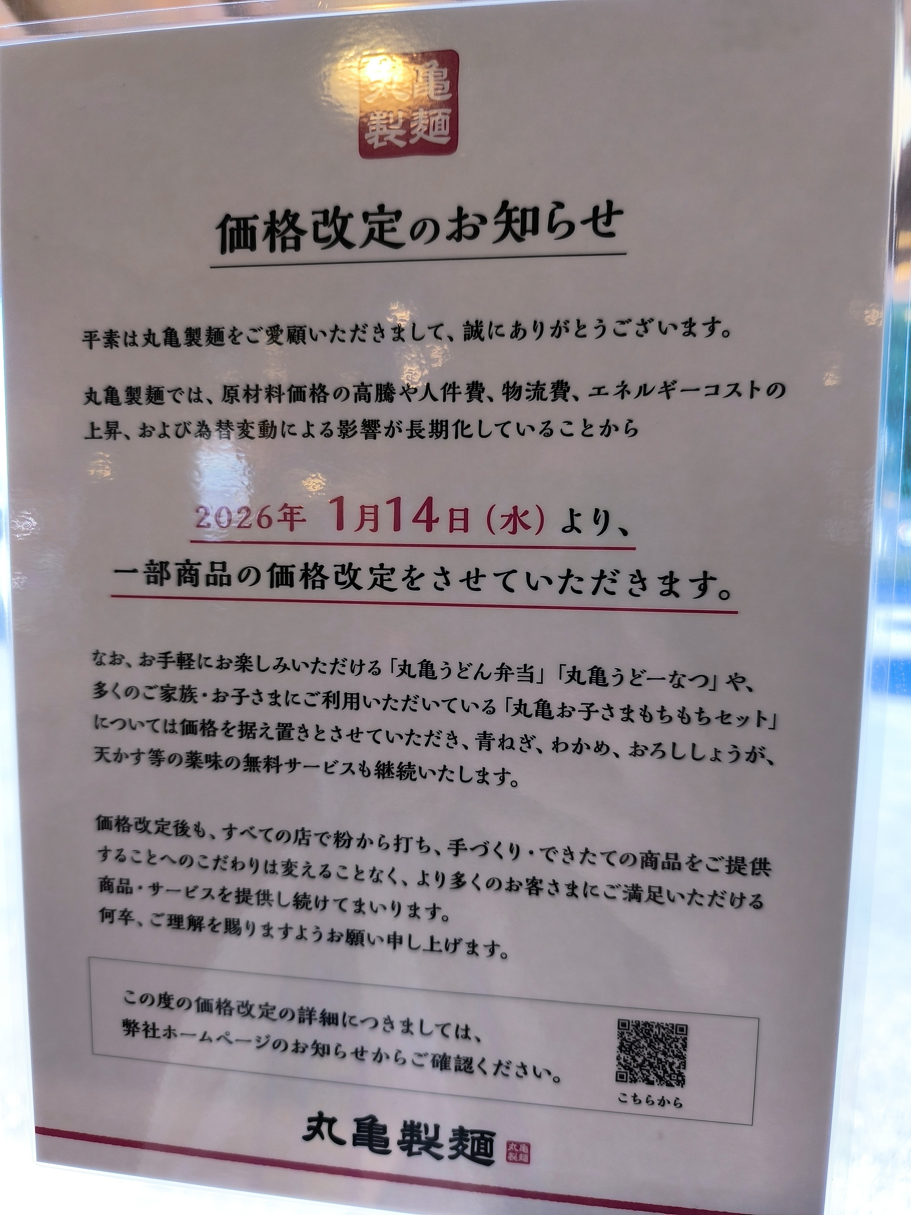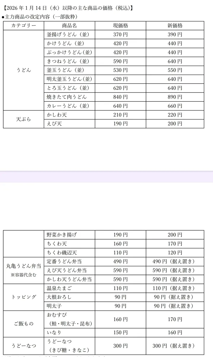 今日丸亀製麺利用したら価格改定の張り紙があり公式ホームページのリリースを確認したら下記の通り価格改定のお知らせがありました🍚