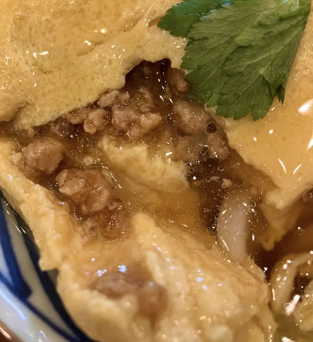 そぼろの甘辛さが、ほどよくあんかけだしやつゆにも溶け込んで、美味しさがさらに増して、きれいにつゆまで頂いた😋