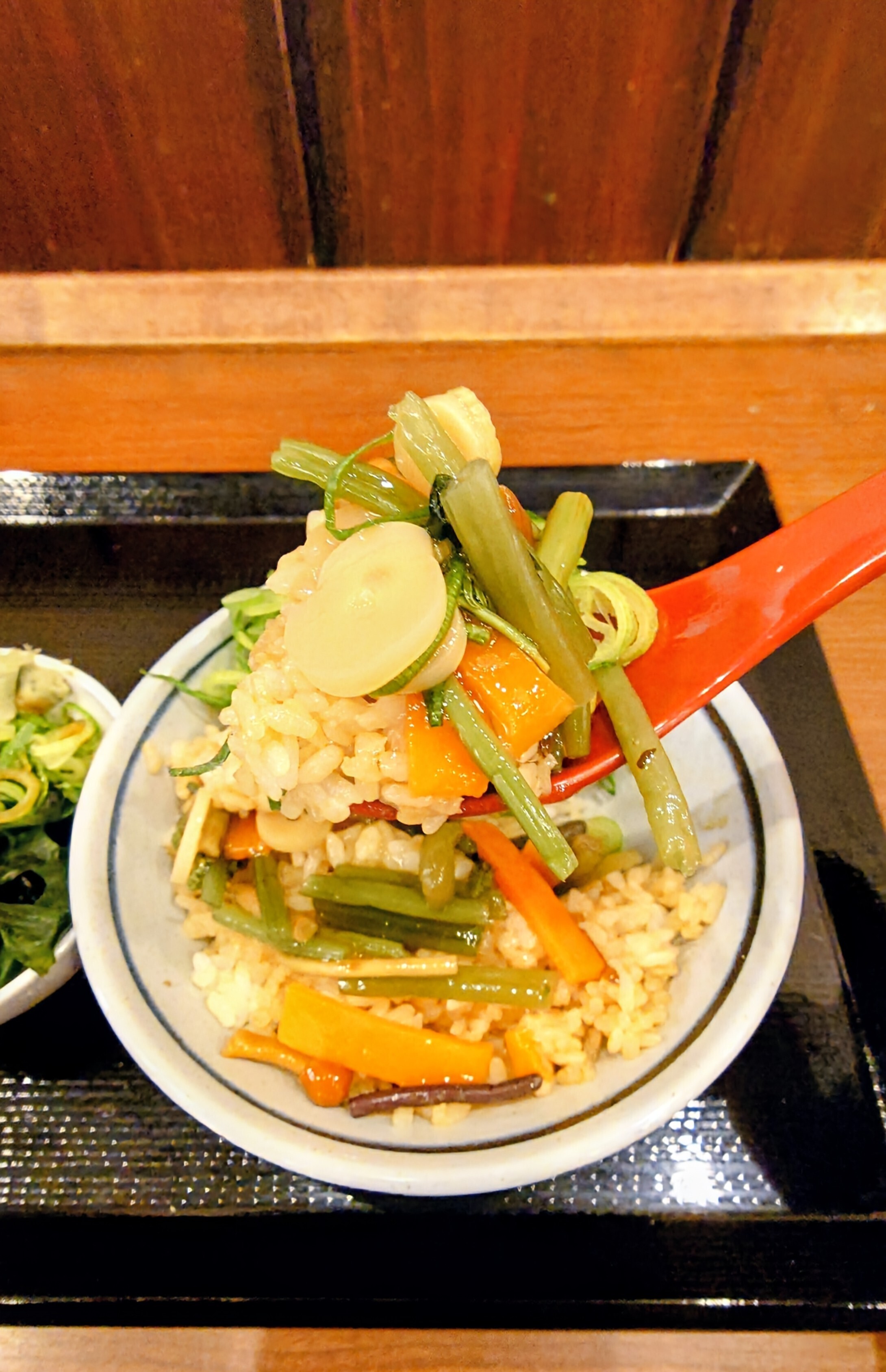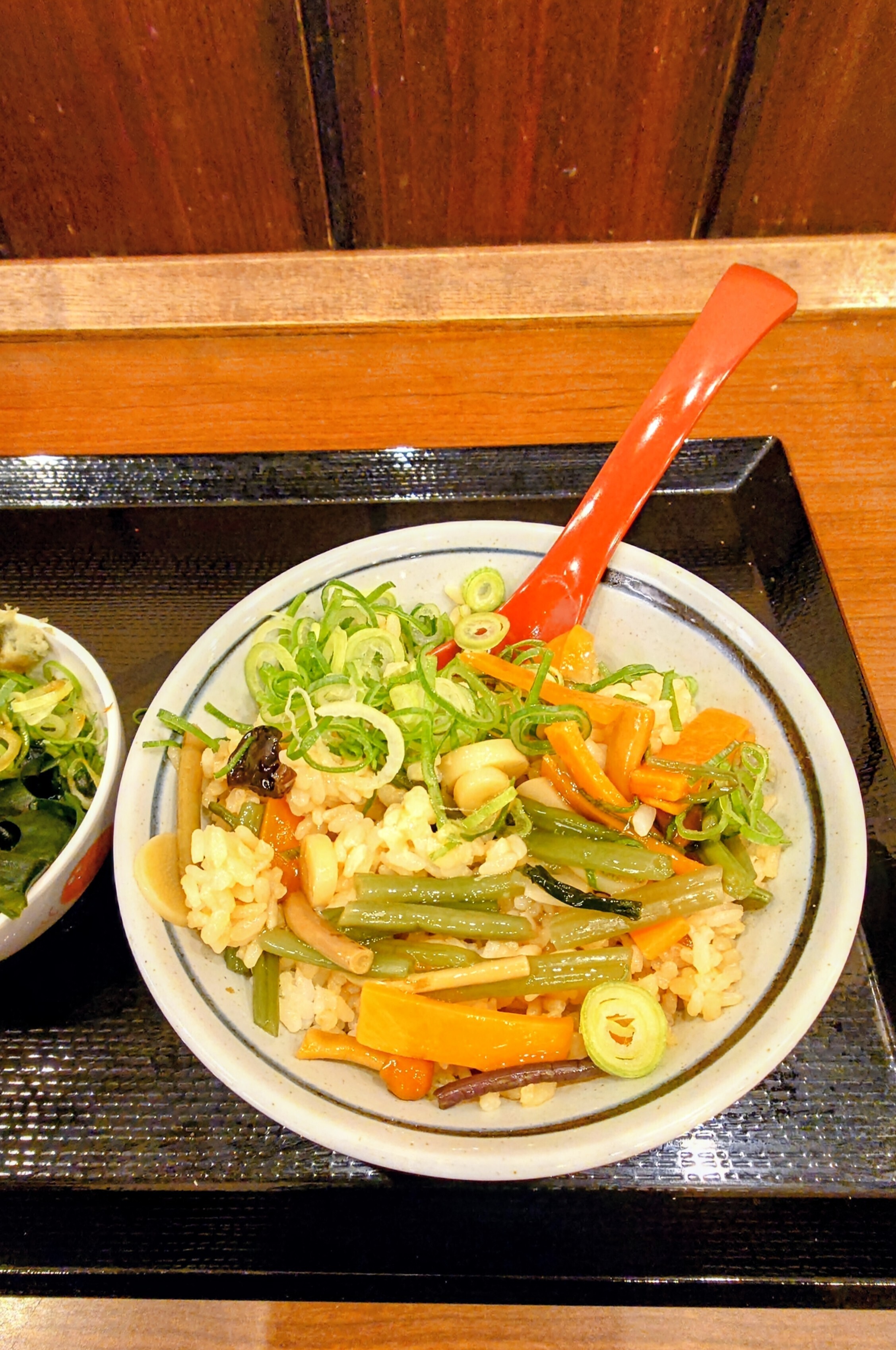 ③山菜うどんから山菜を移植します(多めに入れた方が美味しいです、山菜半分くらいごはんに入れあと山菜うどん(つゆはとろみがあるので綺麗に飲んで)は出汁サーバーで出汁つゆ🐢ネギわかめ天かすに天丼のたれ入れて旨甘かけうどんにして食べてもいいと思います😙)