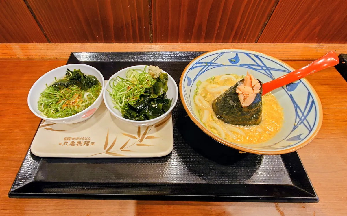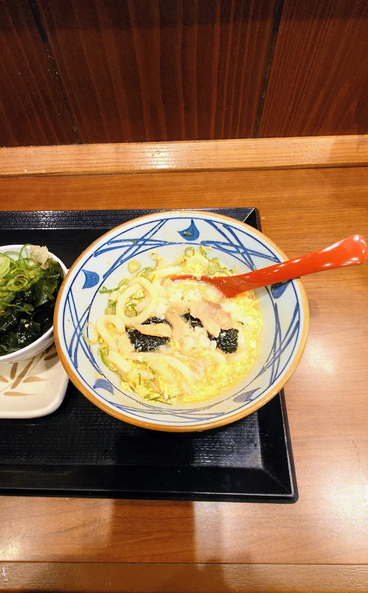 若干うどんが残っていますが鮭🍙をどんぶりに投入(かき混ぜながら食べました🤤)