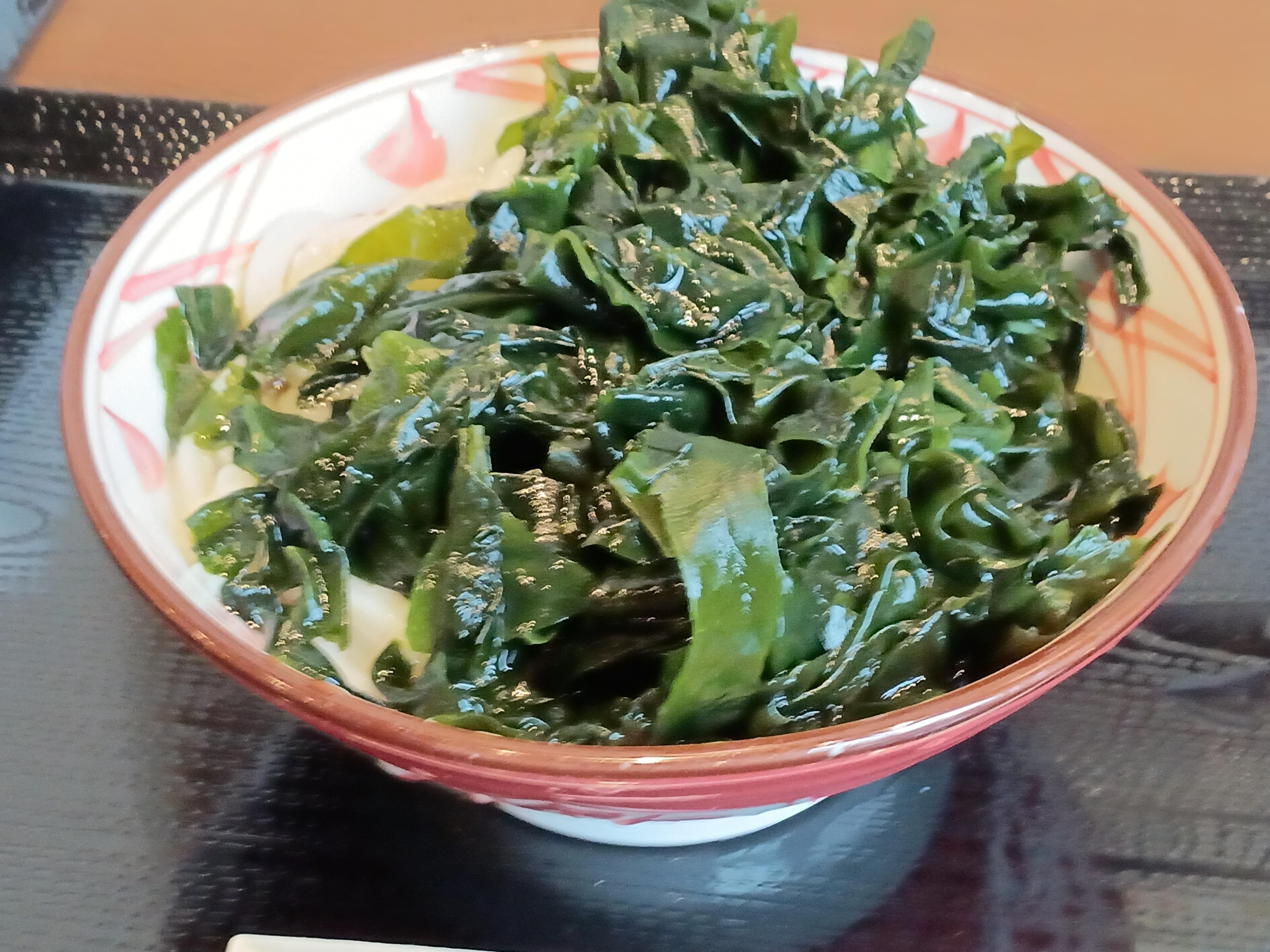 この状態ではわからなくしてしまい申し訳ないけど、とろろをうどん札3枚使って消化試合としました。冷やのかけうどん(小)にとろろを頼み、トッピングとして、ワカメを入れました。
