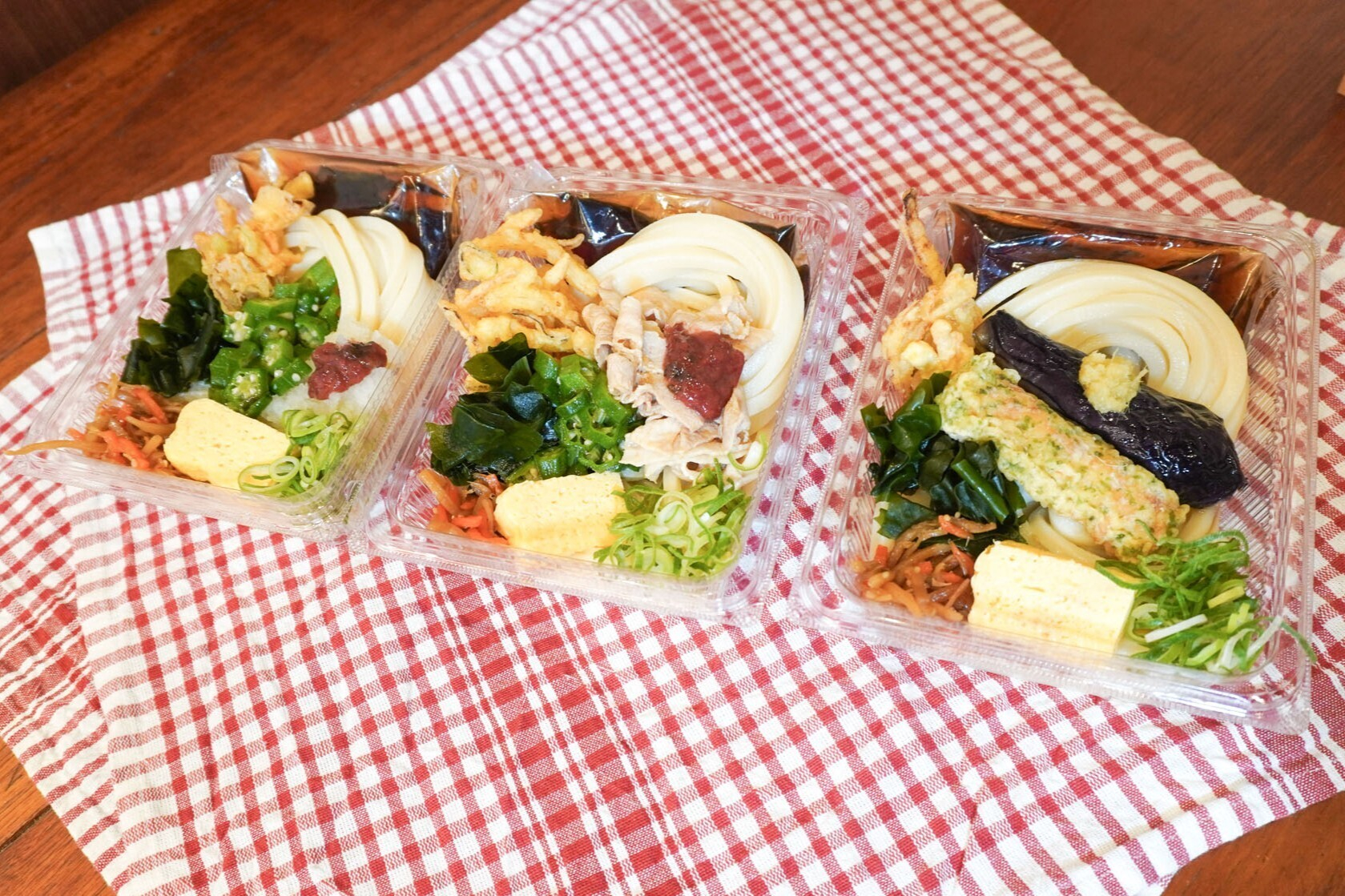 定番のおかずになすの揚げびたしを加えた「なすの揚げびたしと定番おかずのうどん弁当」(並640円、大830円)、梅肉とシャキシャキのオクラや大根おろしなどを盛った「梅おろしオクラうどん弁当」(並450円、大640円)、やわらかな豚しゃぶに梅肉を添え、オクラなども詰めた「豚しゃぶと梅オクラうどん弁当」(並690円、大880円)が販売開始です✨