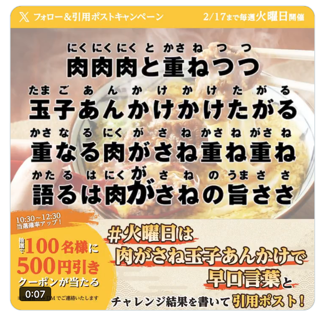 ②#火曜日は肉がさね玉子あんかけで早口言葉 をつけて、早口言葉にチャレンジした結果を書いて、「引用」ポストします。
