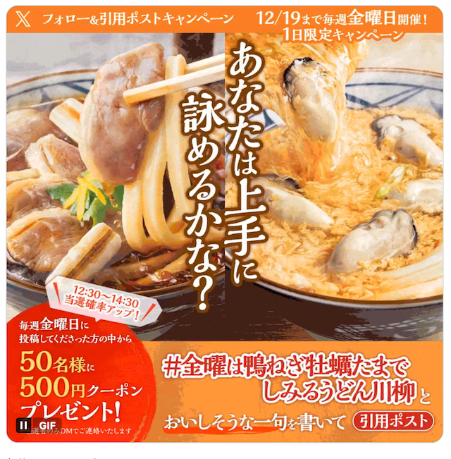 トップ > MARUGAMEgram > みんなのなんでも写真館 > いよいよ最終週、金曜は鴨ねぎ牡蠣たまでしみるうどん川柳キャンペーン cosmepico 2025/12/19 14:11 いよいよ最終週、金曜は鴨ねぎ牡蠣たまでしみるうどん川柳キャンペーン @UdonMarugameをフォロー#金曜は鴨ねぎ牡蠣たまでしみるうどん川柳 を付け、おいしそうな一句を書いて「引用」ポスト!500円引クーポンが50名に当たります! 応募期限は12/20(土)10:29までです! 50名と当選者数は少ないですが、ぜひチャレンジしてみてください! いいね 共有する 共有する X LINE リンクをコピー コメントする 2 件の返信 (新着順) ミュートしたユーザーの投稿です。 投稿を表示 ブルーサルビア 2025/12/20 16:36 指折り数えて言葉選んだのに、ポチった後に字足らずだった💦 頭冴えてなかったです。 いいね 返信する ミュートしたユーザーの投稿です。 投稿を表示 cosmepico 2025/12/20 22:34 ブルーサルビア 川柳ですから、字余り、字足らずも味があっていいかも。 いいね 返信する ミュートしたユーザーの投稿です。 投稿を表示 武蔵 2025/12/19 16:59 cosmepicoさんの幸運を私にも分け与えてください🙇 いいね 返信する 他 2 件の返信を表示 ミュートしたユーザーの投稿です。 投稿を表示 cosmepico 2025/12/19 20:36 武蔵 わたしは前回、運を使い果たしてしまったような気がするので、あまりお役に立てませんが、武蔵さんの幸運をお祈りします! いいね 返信する ミュートしたユーザーの投稿です。 投稿を表示 武蔵 2025/12/19 21:09 cosmepico 当選も嬉しいですがその前に来週のCT検査でよい結果が出るほうが嬉しいです😊 いいね 返信する ミュートしたユーザーの投稿です。 投稿を表示 cosmepico 2025/12/19 21:18 武蔵 ですよね。 こちらも微力ながら、お祈りしています。 いいね 返信する ミュートしたユーザーの投稿です。 投稿を表示 武蔵 2025/12/20 09:31 cosmepico 有り難う御座います🙇 月曜日にCT検査する事になり問題が無ければ火曜日もしくは水曜日の退院になりそうです😀 いいね 返信する