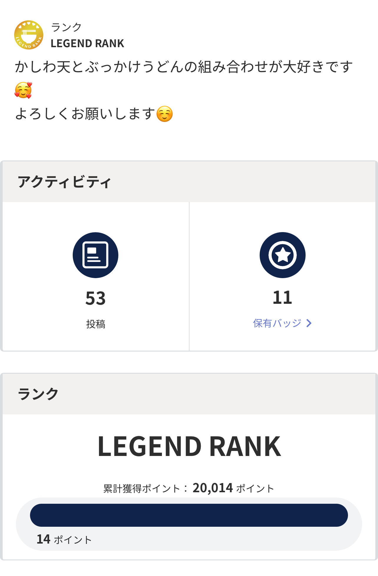 トップ > MARUGAMEgram > ついに…レジェンドランクに…! もこ 2025/10/08 22:49 ついに…レジェンドランクに…! ついに念願だったレジェンドランクに到達しました!! 今日を迎えるまでMochiMochiクラブで皆さんの美味しそうな写真を見ながら、食べに行けない日も気分を味わいながら楽しむことができました☺️ これからも皆さんと楽しくこのコミュニティで語り合って行けたら嬉しいです!これからもよろしくお願いします〜!😊 いいね 共有する 共有する X LINE リンクをコピー コメントする 21 件の返信 (新着順) ミュートしたユーザーの投稿です。 投稿を表示 こねこね 2025/10/11 14:32 おめでとうございます🎉 私は昨日始めたばかりですが、気長に目指したいと思います! いいね 返信する ミュートしたユーザーの投稿です。 投稿を表示 もこ 2025/10/11 23:18 こねこね ありがとうございます!昨日からなんですね!😳これからぜひよろしくお願いします☺️ いいね 返信する ミュートしたユーザーの投稿です。 投稿を表示 よしこさん 2025/10/10 13:09 おめでとう🎉ございます。 いいね 返信する ミュートしたユーザーの投稿です。 投稿を表示 もこ 2025/10/11 23:18 よしこさん ありがとうございます!☺️ いいね 返信する ミュートしたユーザーの投稿です。 投稿を表示 年越うどん 2025/10/10 01:17 おめでとう㊗️ございます〜 いいね 返信する ミュートしたユーザーの投稿です。 投稿を表示 もこ 2025/10/11 23:17 年越うどん ありがとうございます!達成できました!😊 いいね 返信する ミュートしたユーザーの投稿です。 投稿を表示 社長くん 2025/10/09 22:55 おめでとうございます! 私も地道に頑張っています! いいね 返信する ミュートしたユーザーの投稿です。 投稿を表示 もこ 2025/10/11 23:17 社長くん ありがとうございます!これからも次のランクに向けてお互い頑張りましょう〜🏃♂️ いいね 返信する ミュートしたユーザーの投稿です。 投稿を表示 からあげ 2025/10/09 22:44 おめでとうございます!!! いいね 返信する ミュートしたユーザーの投稿です。 投稿を表示 もこ 2025/10/11 23:16 からあげ ありがとうございます!!😆 いいね 返信する ミュートしたユーザーの投稿です。 投稿を表示 いも天大好き 2025/10/09 21:18 到達おめでとうございます🎉 いいね 返信する ミュートしたユーザーの投稿です。 投稿を表示 もこ 2025/10/11 23:16 いも天大好き ありがとうございます!やっと到達できました☺️ いいね 返信する ミュートしたユーザーの投稿です。 投稿を表示 よぴの 2025/10/09 20:03 おめでとうございます🎉 いいね 返信する ミュートしたユーザーの投稿です。 投稿を表示 もこ 2025/10/11 23:16 よぴの ありがとうございます!☺️ いいね 返信する ミュートしたユーザーの投稿です。 投稿を表示 n27 2025/10/09 18:02 おめでとうございます!レジェンドの次は何になるか楽しみですね🎶 いいね 返信する ミュートしたユーザーの投稿です。 投稿を表示 もこ 2025/10/11 23:15 n27 ありがとうございます!今後どんなランクになるのか楽しみです!😊 いいね 返信する ミュートしたユーザーの投稿です。 投稿を表示 ワンダワンダ 2025/10/09 17:38 おめでとうございます いいね 返信する ミュートしたユーザーの投稿です。 投稿を表示 もこ 2025/10/11 23:15 ワンダワンダ ありがとうございます!😊 いいね 返信する ミュートしたユーザーの投稿です。 投稿を表示 しゅう 2025/10/09 12:34 おめでとうございます!!!! いいね 返信する ミュートしたユーザーの投稿です。 投稿を表示 もこ 2025/10/11 23:14 しゅう ありがとうございます!!😆 いいね 返信する もっと見る