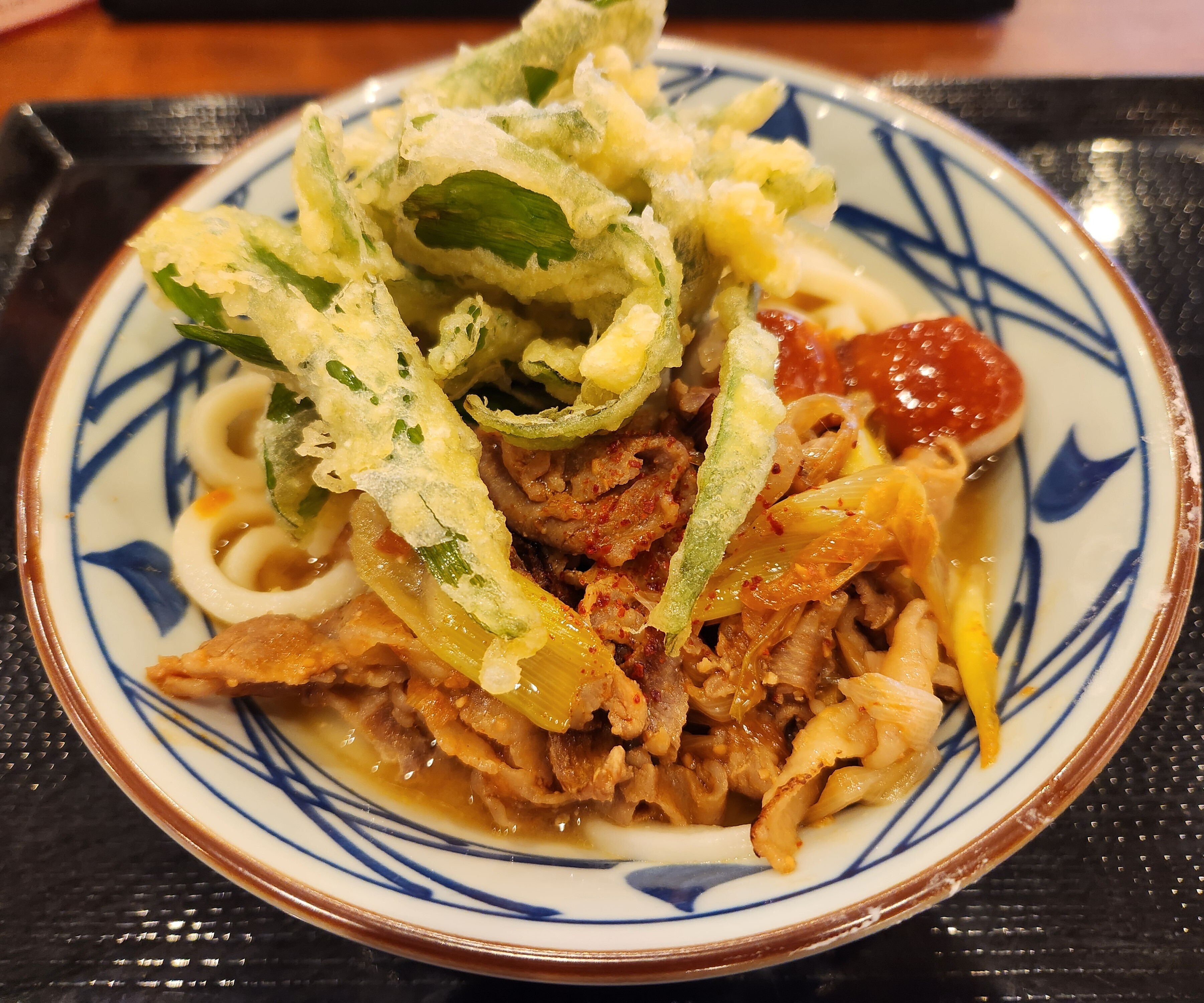 食べた感想ですが、豚肉と味噌うどんの組み合わせがばっちしですね、めちゃくちゃ美味しかったです✨🍀コロッとした里芋も食感変えるのに丁度良いですし、深谷ねぎのかき揚げも軽いサクサク感で重くなく、ねぎ自体の旨味もしっかり閉じ込められていました。全ての素材の組み合わせがバランスよく無駄がありません。写真の色味的には派手さがなく、もしかしたら全国的には注目度も低いかなぁと無責任に思ってしまっていますが、味最高です❗完食完飲しました。