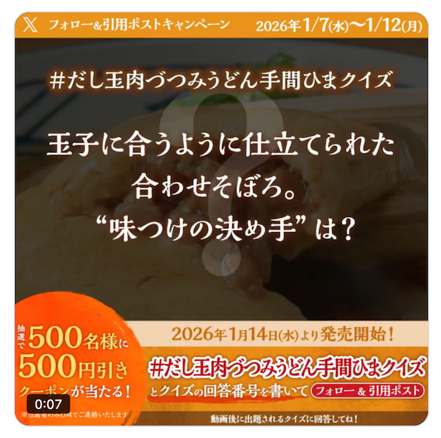 ②#だし玉肉づつみうどん手間ひまクイズ を付け、回答番号を書いて「引用」ポスト