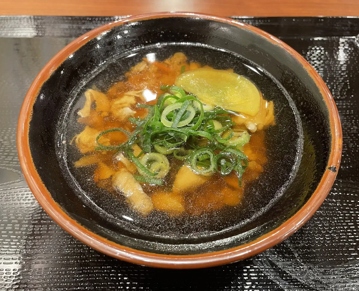 かけうどんのおだしと薬味のねぎを