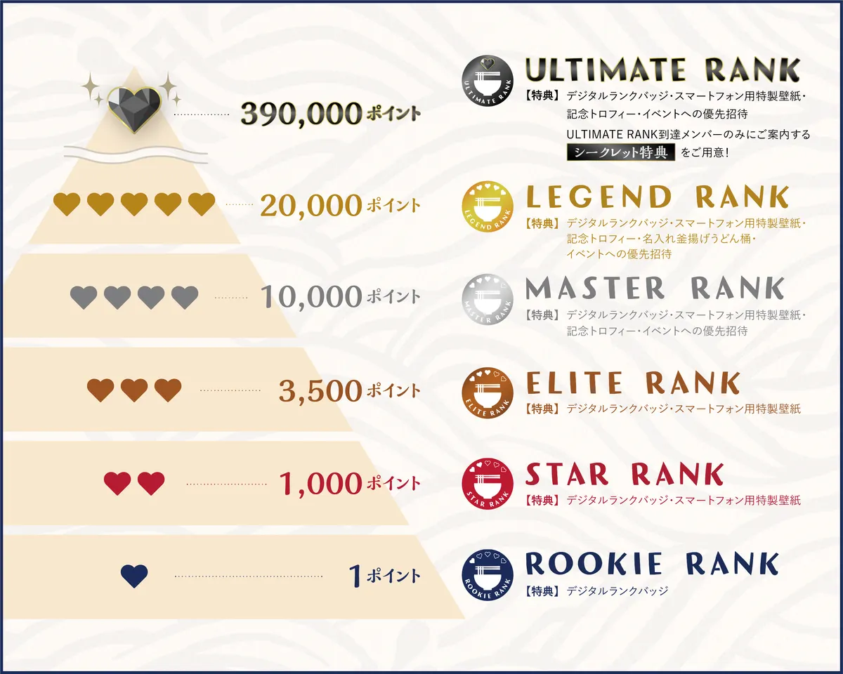 丸亀製麺Mochi-Mochiクラブでは、コミュニティでの活動により貯まる「Mochi-Mochiポイント」に応じて、「LOVERS RANK(ラヴァーズランク)」がアップし、ランクに合わせた特典を受けることができます。