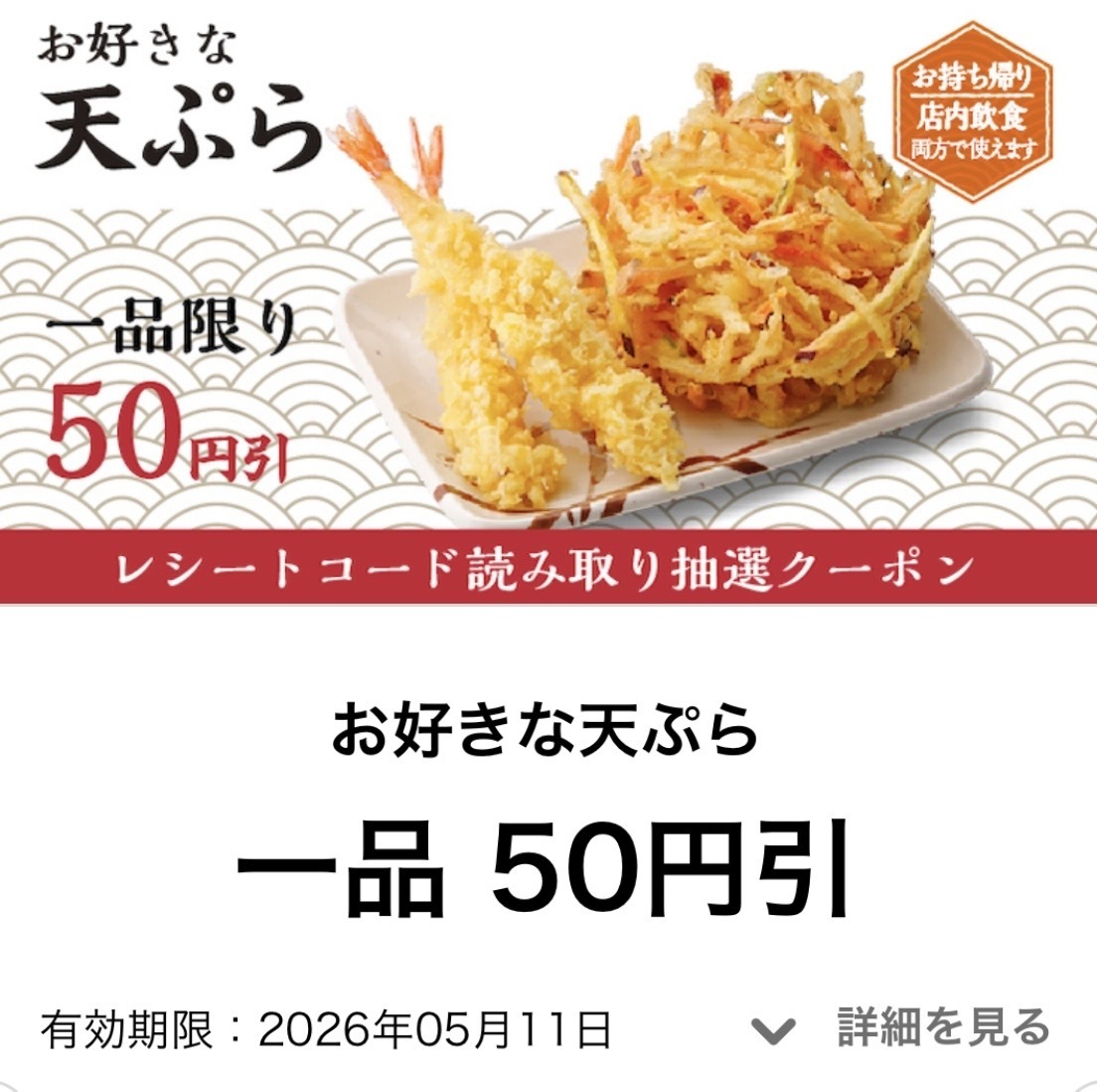 投稿を表示天ぷら50円引きクーポンおめでとうございます🎉