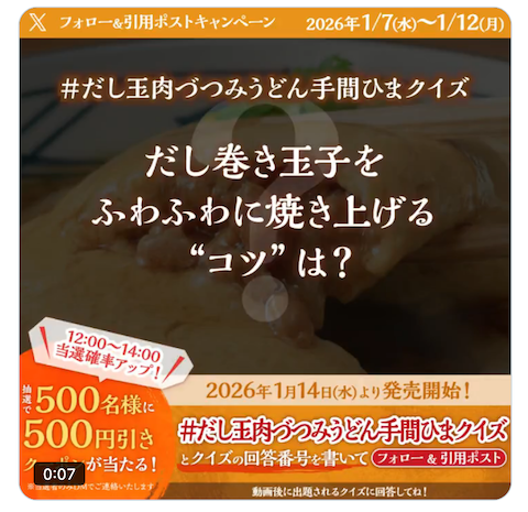 トップ > MARUGAMEgram > みんなのなんでも写真館 > キャンペーン2日目 cosmepico 2026/01/08 12:05 キャンペーン2日目 X公式アカウントの、丸亀製麺手間ひまクイズキャンペーン2日目。 ご注文ごとに焼き上げたふわふわのだし巻き玉子がのった「だし玉肉づつみうどん」「手間ひま」かけただし巻き玉子にまつわるクイズに回答すると、500円引きクーポンが6日間合計500人に当たります。 参加方法は、 ①@UdonMarugameをフォロー ②#だし玉肉づつみうどん手間ひまクイズ を付け、回答番号を書いて「引用」ポスト ③当選者のみDMが届きます。 2日目もぜひご応募を! いいね 共有する 共有する X LINE リンクをコピー コメントする 2 件の返信 (新着順) ミュートしたユーザーの投稿です。 投稿を表示 年越うどん 2026/01/09 01:03 当たって〜 ほんと、当たって〜 いいね 返信する ミュートしたユーザーの投稿です。 投稿を表示 cosmepico 2026/01/09 13:21 年越うどん わたしも当たりたいです😊 いいね 返信する ミュートしたユーザーの投稿です。 投稿を表示 武蔵 2026/01/08 13:56 有り難うございます🙇 引用ポスト忘れてました😅 14時までは当選確率2倍?ですから😁 いいね 返信する ミュートしたユーザーの投稿です。 投稿を表示 cosmepico 2026/01/08 14:29 武蔵 ハッシュタグもきのうと変わってますのでご注意を。 いいね 返信する