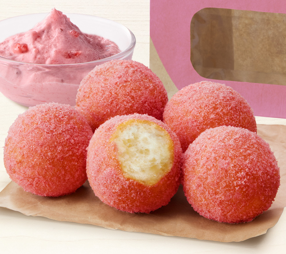 ソースを付けると苺の味わいとミルク感が口いっぱいに広がる、春にぴったりのどーなつです💕