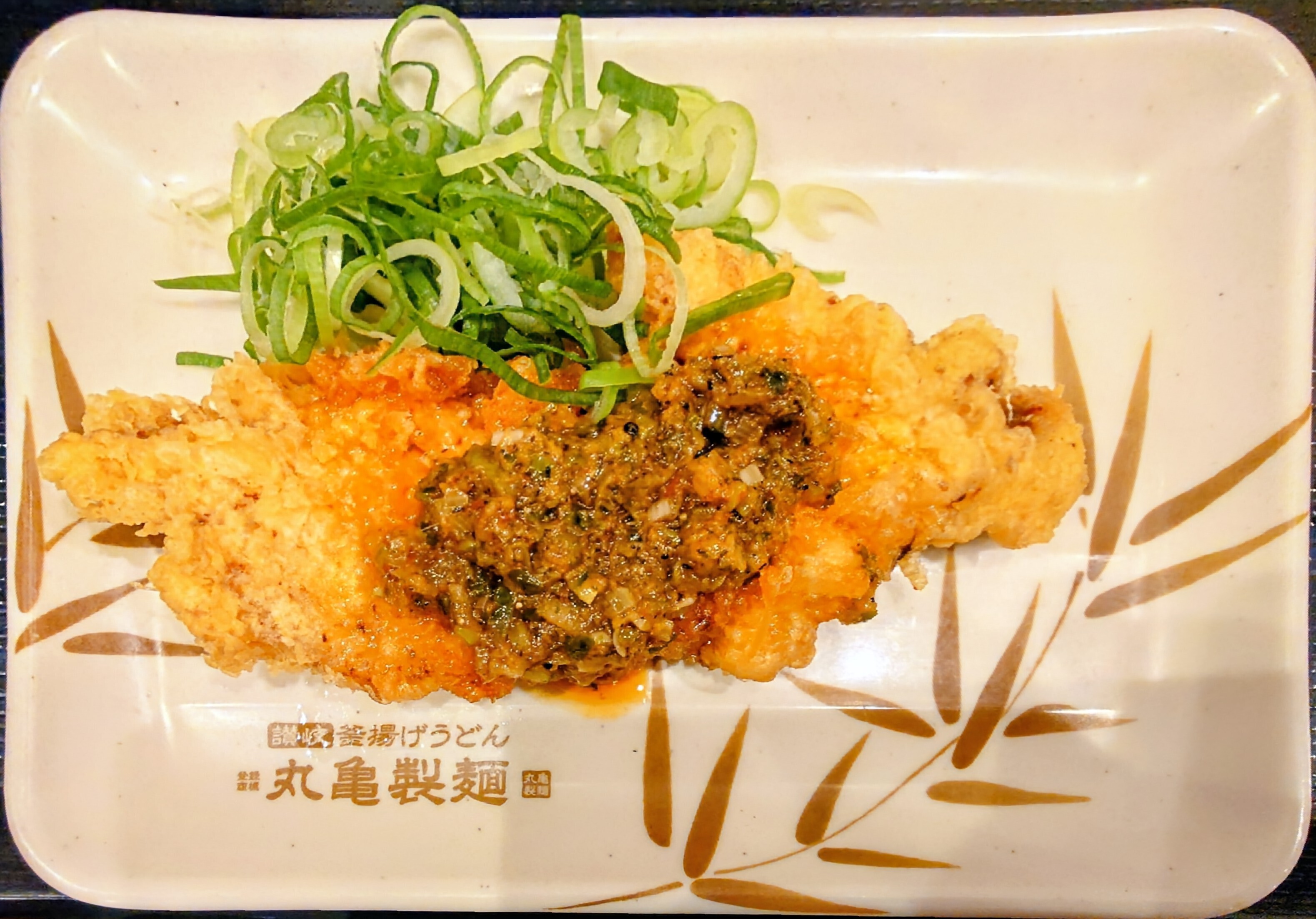 かしわ天にしび辛ラー油をかけ🐢ネギトッピングして食べました😙