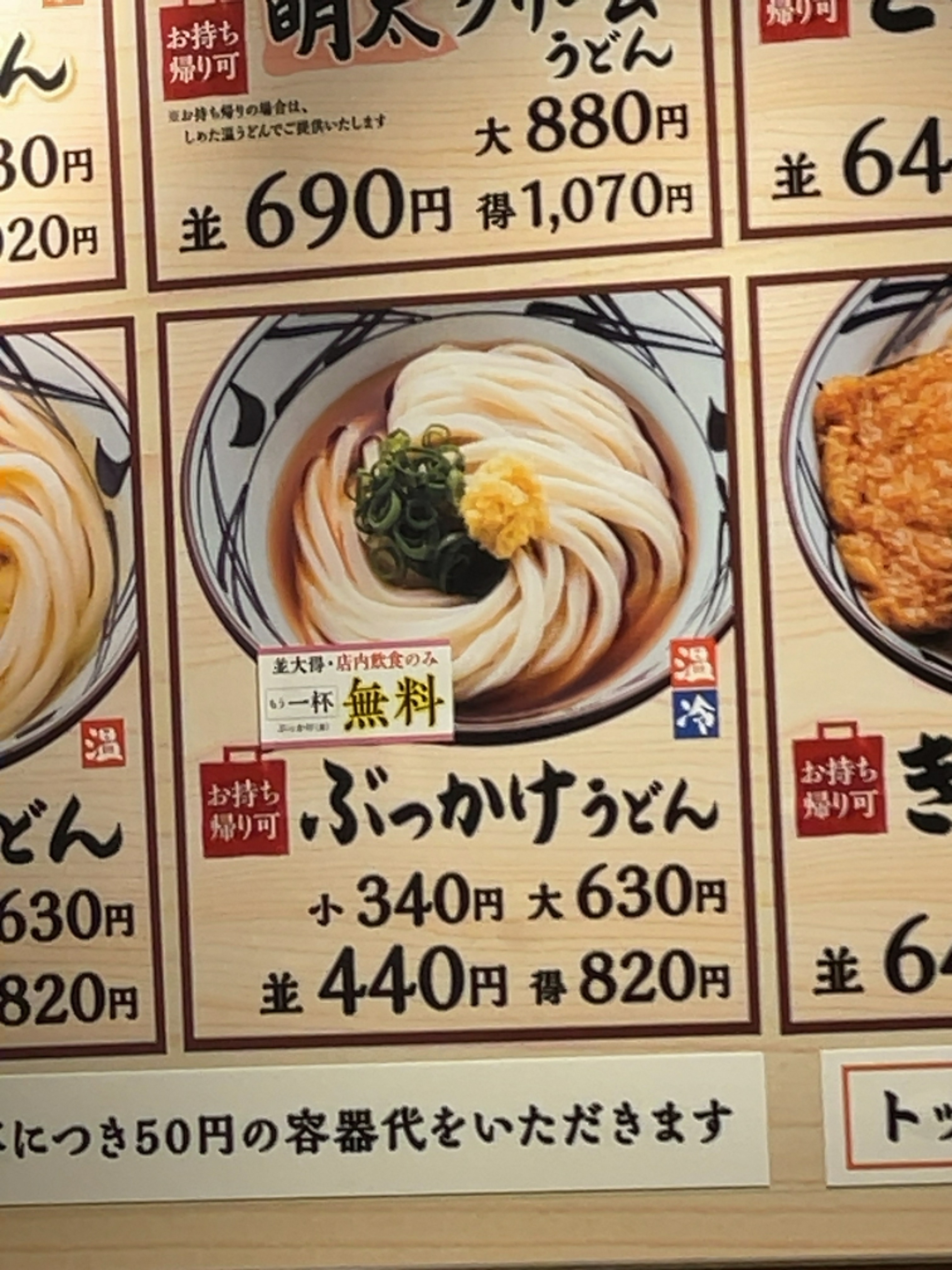 ぶっかけうどんもう一杯無料を目当てに、奥さんと近所の丸亀に行きました。