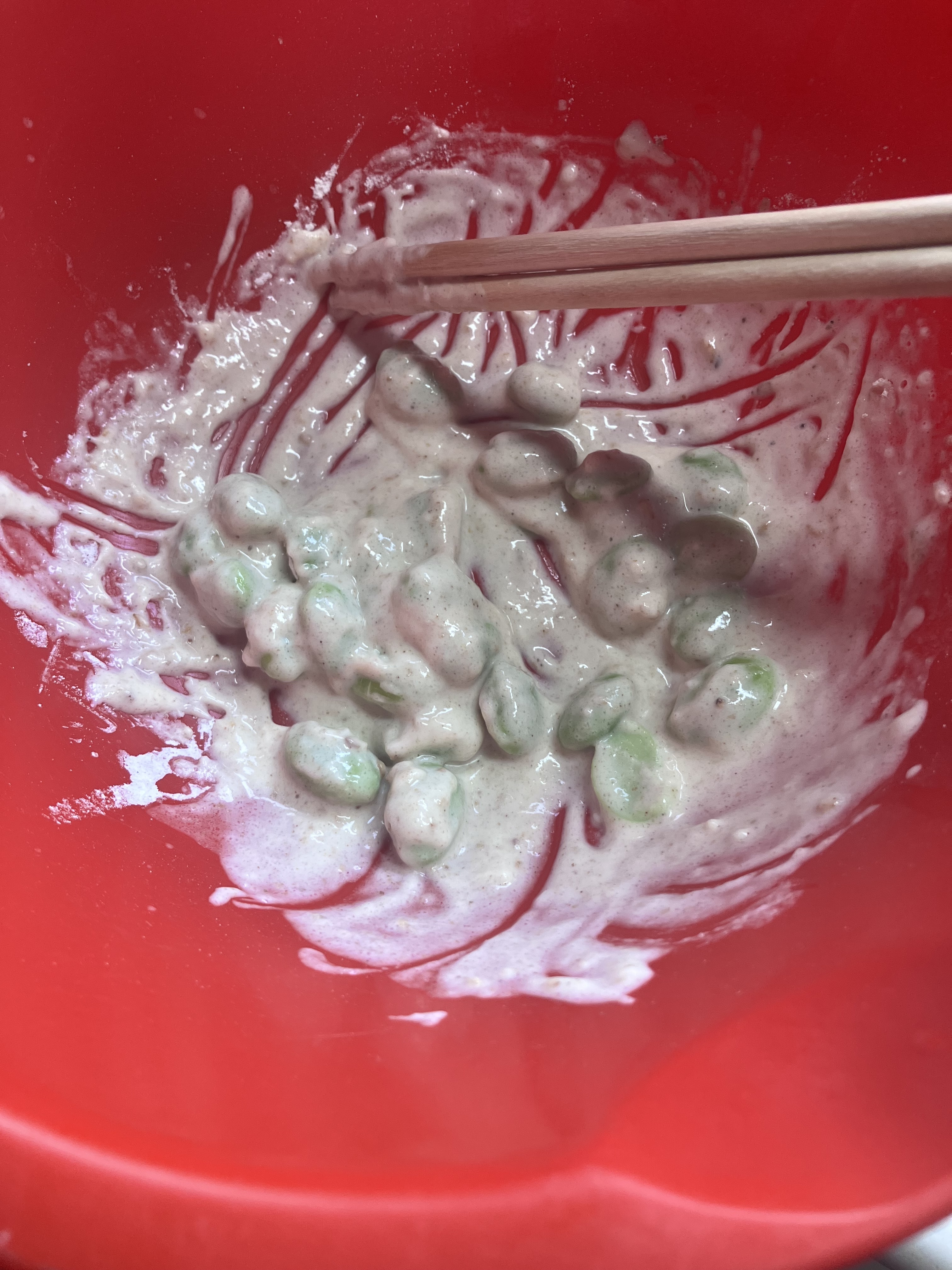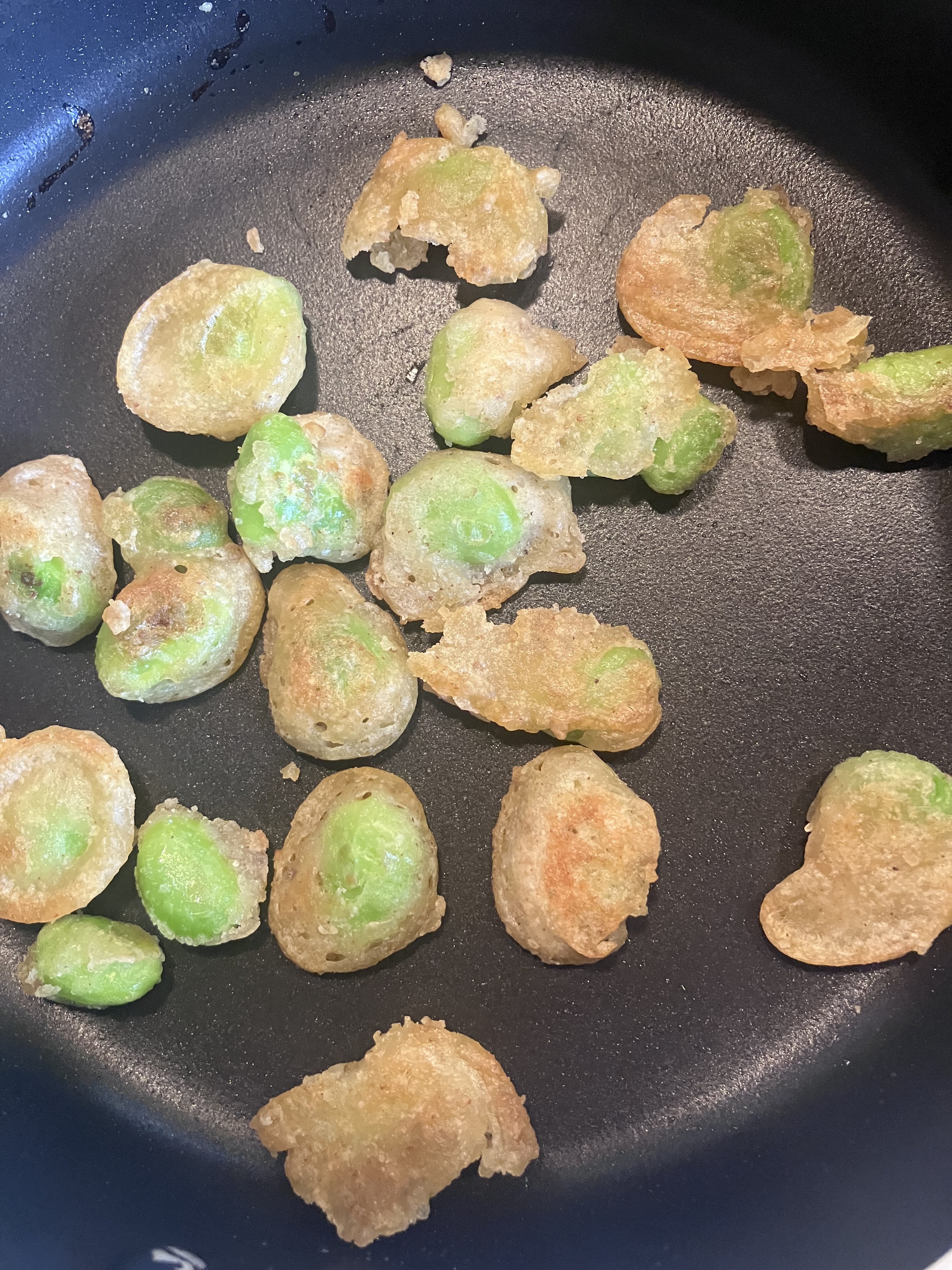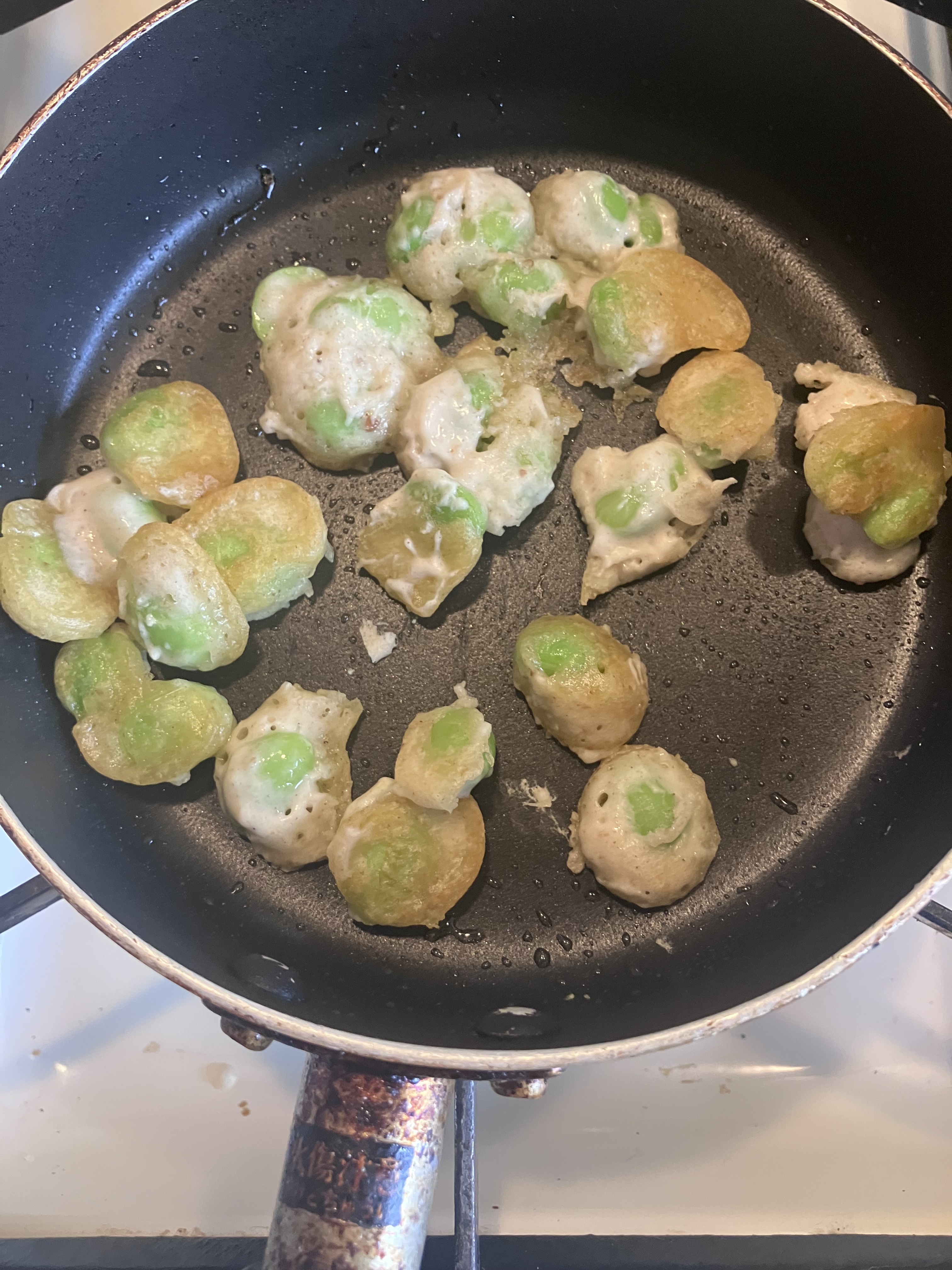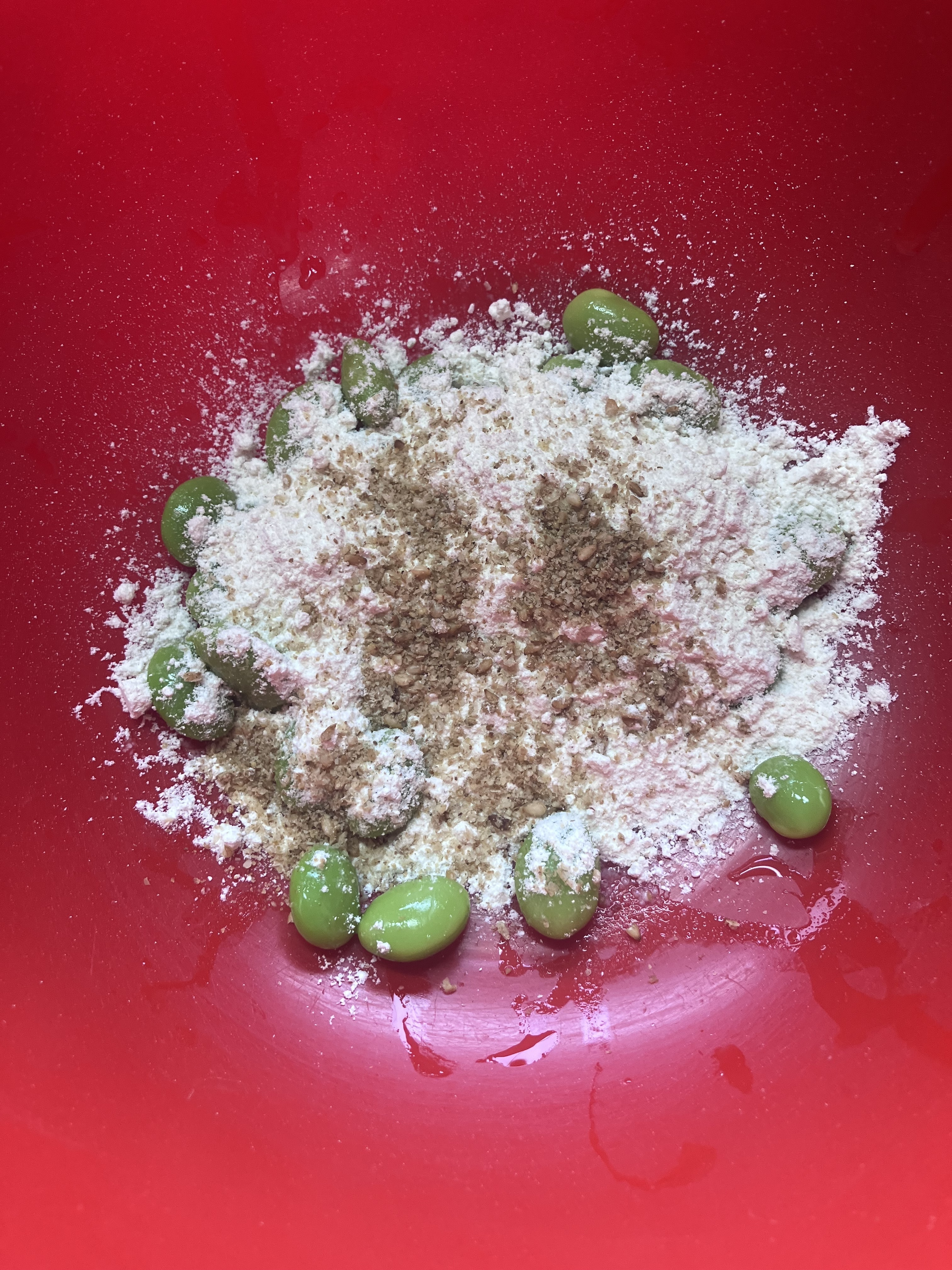 粉を多くして、豆🫛にしっかり纏わせてフライパンに並べて行きます