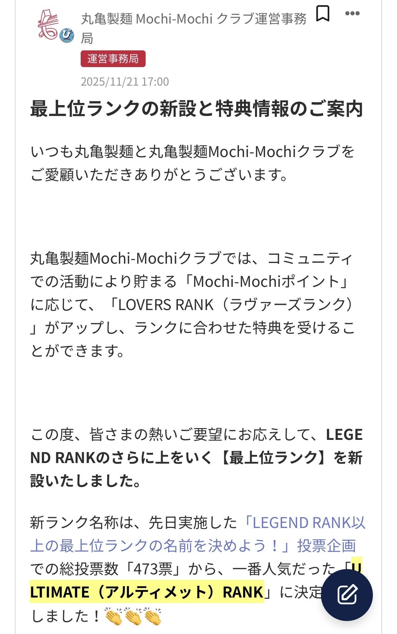 トップ > MARUGAMEgram > 今日の丸亀 > あるてぃめっっっっと〜 丸芳 2025/11/21 18:22 あるてぃめっっっっと〜 道は険し…😭 精進します💪 笑 新ランク 最上位ランク いいね 共有する 共有する X LINE リンクをコピー コメントする 5 件の返信 (新着順) ミュートしたユーザーの投稿です。 投稿を表示 年越うどん 2025/11/23 14:31 成せばなる! 千里の道も一ポチから! いいね 返信する ミュートしたユーザーの投稿です。 投稿を表示 からあげ 2025/11/21 23:28 がんばりましょう、🙂↕️🙂↕️ いいね 返信する ミュートしたユーザーの投稿です。 投稿を表示 ake 2025/11/21 23:26 遠いですね( ゚д゚)ハッ! いいね 返信する ミュートしたユーザーの投稿です。 投稿を表示 からあげ 2025/11/21 23:27 ake ですねー!、 いいね 返信する ミュートしたユーザーの投稿です。 投稿を表示 岐阜のかっちゃん 2025/11/21 21:12 👑LEGEND RANK👑から〜の、👑ULTIMATE RANK👑への道が果てしなく遠く感じますね。 私の場合ですと、1年でだいたい20,000Pointくらいは取れると仮定して390,000を20,000で割ると、19.5になりますね。 19.5。即ち、19年6カ月くらいかかってようやく👑ULTIMATE RANK👑ということになります。 この“丸亀製麺Mochi-Mochiクラブ”に初めて入ったのが、46歳なので、この調子ですと、私は65歳か66歳くらいにならないと達成できない滅茶苦茶遠い遠い未来になりました。生きてられるか滅茶苦茶心配ですが、どうか宜しくお願い致します。 いいね 返信する ミュートしたユーザーの投稿です。 投稿を表示 からあげ 2025/11/21 23:27 岐阜のかっちゃん 何十年ものの繋がりになりますね! いいね 返信する ミュートしたユーザーの投稿です。 投稿を表示 社長くん 2025/11/21 20:52 遠いなー いいね 返信する ミュートしたユーザーの投稿です。 投稿を表示 からあげ 2025/11/21 23:27 社長くん 長すぎますね、 いいね 返信する