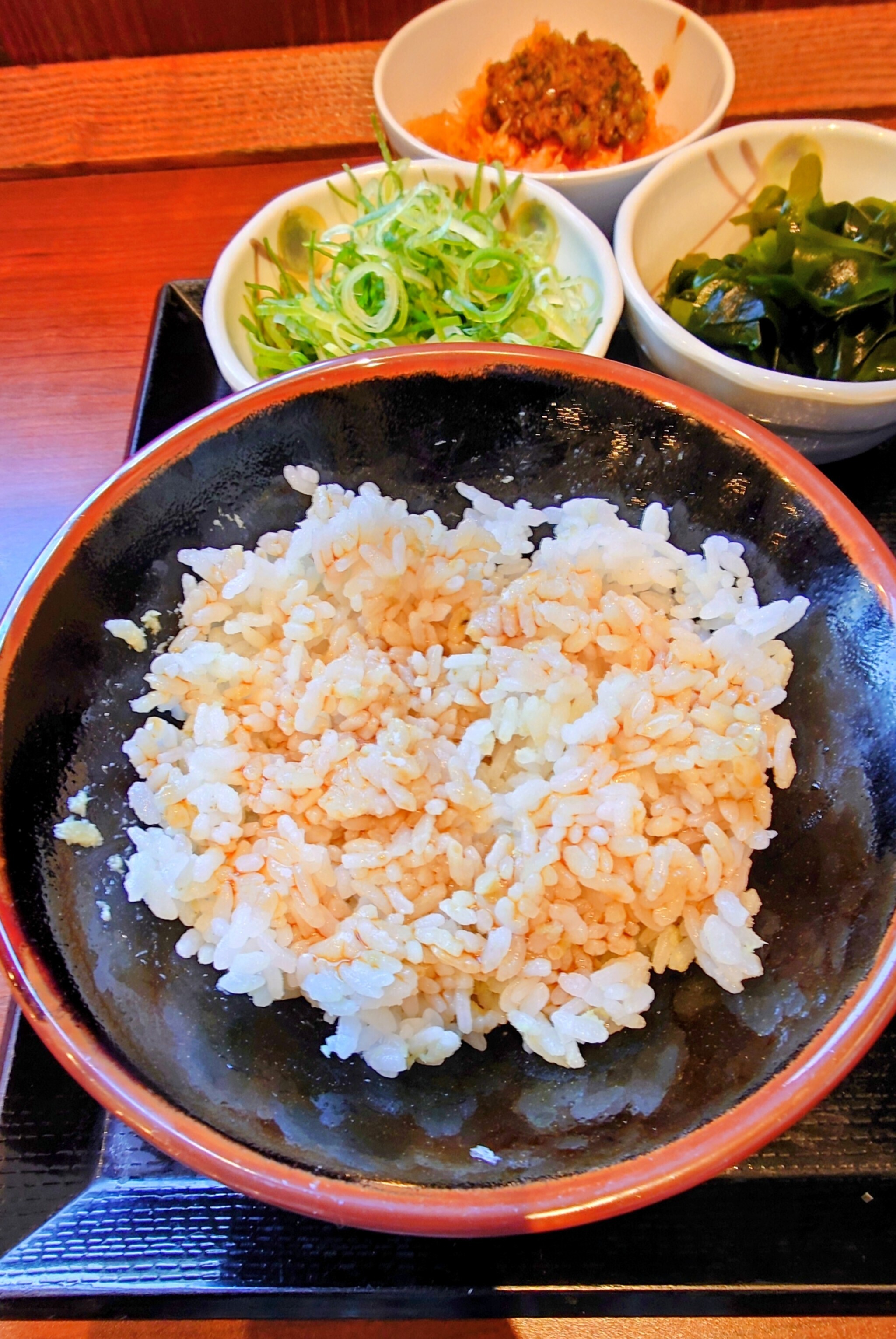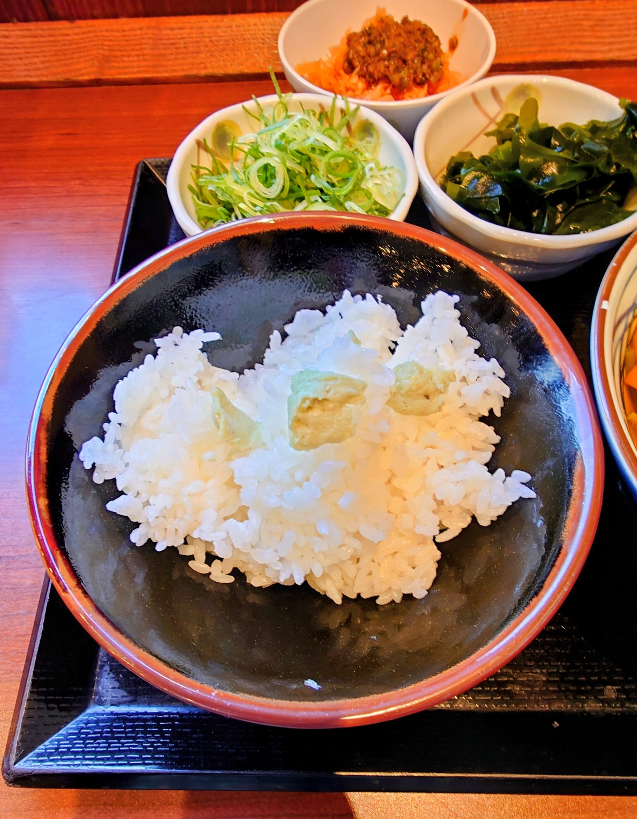 山菜うどんとごはんを使い山菜ごはんを店内製造しましたまずわさびをごはんにのせて🥢でよくかき混ぜて(結構わさびの匂いがツーンが鼻にくる🤧)