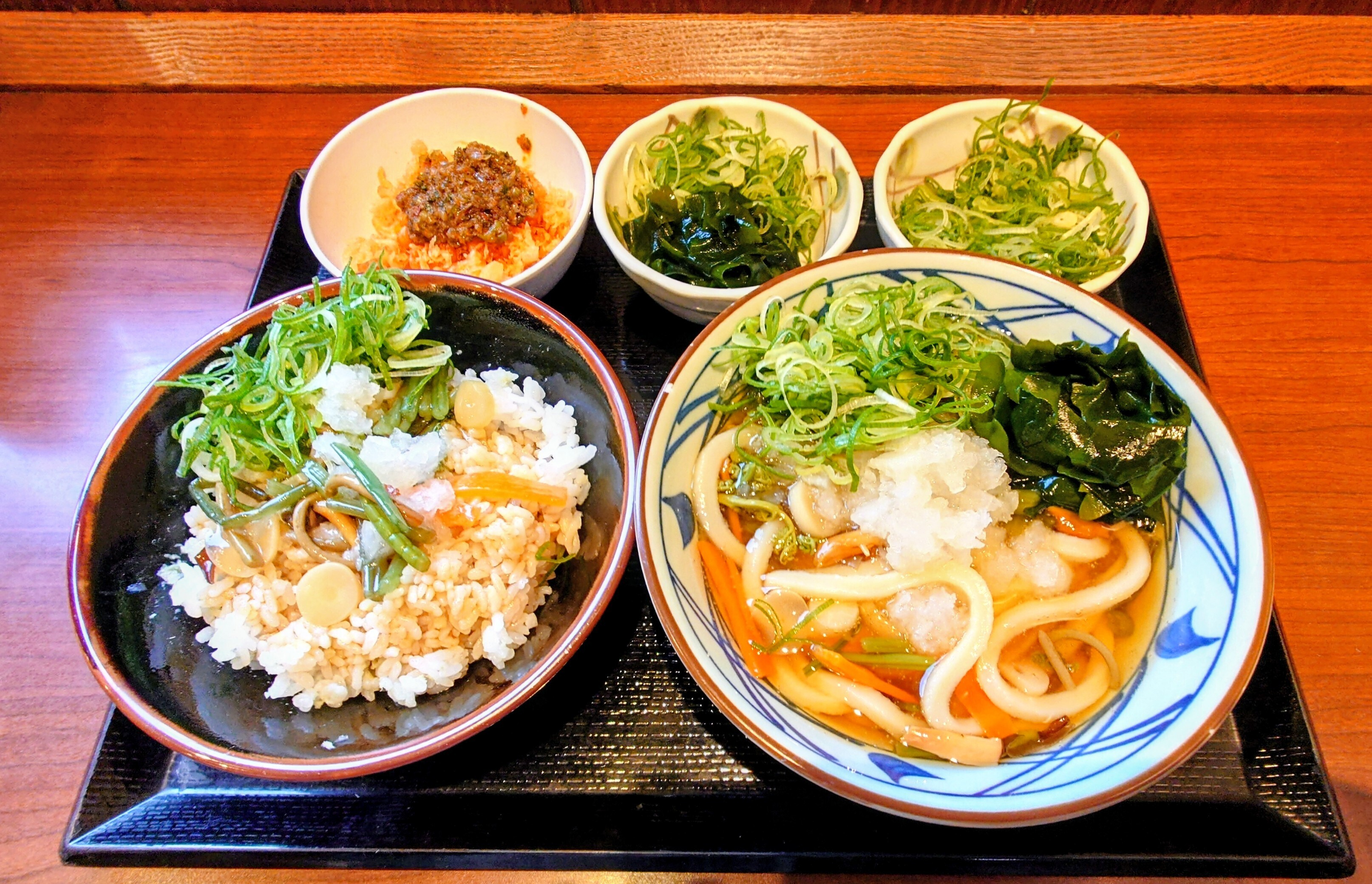その後出汁醤油を入れかき混ぜて山菜うどんの山菜を移動、🐢ネギ、おろしをトッピングしました😙