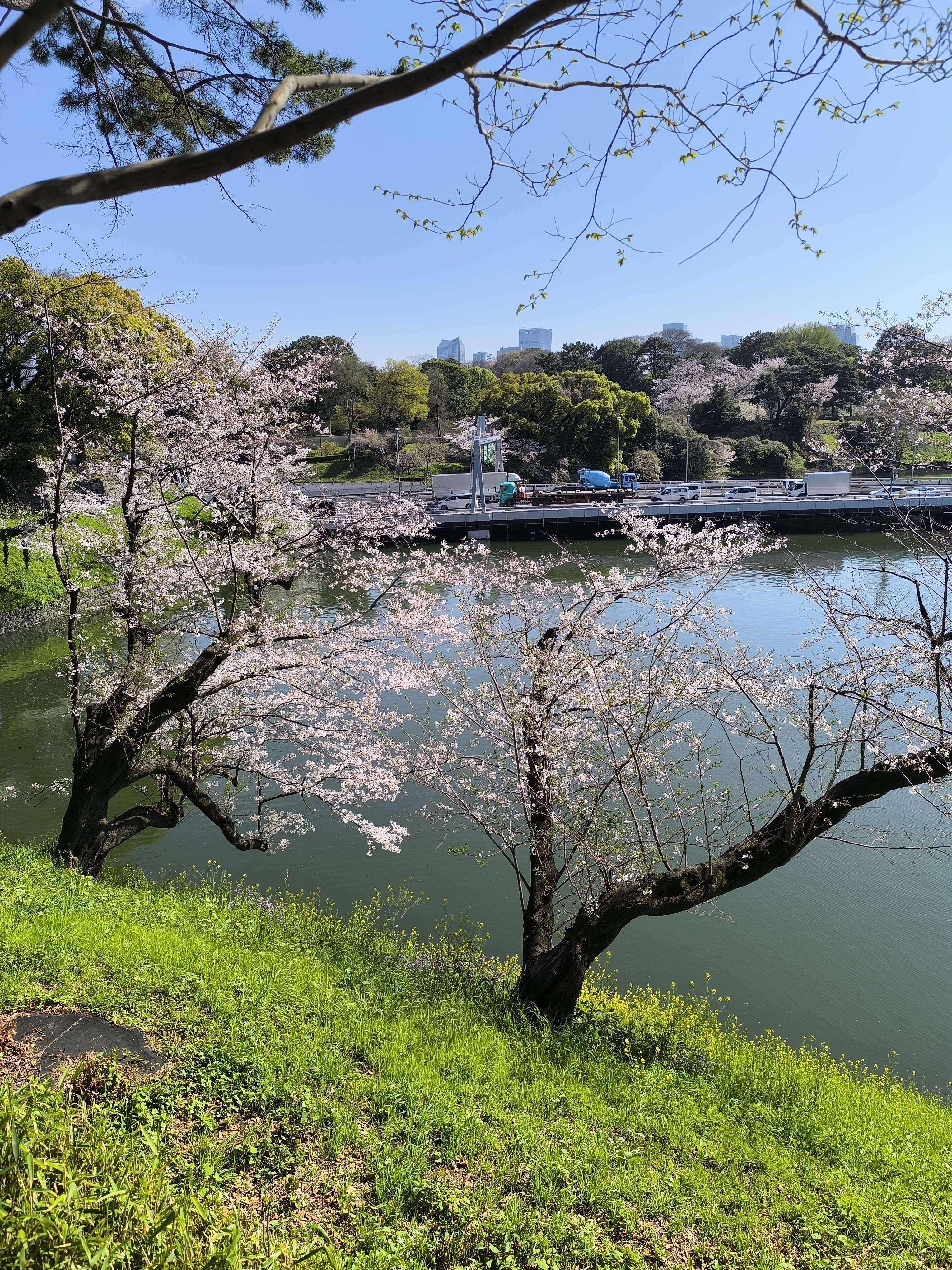 満開の桜と緑の草と池のコラボ美しいですね🌸🍀🌸🍀