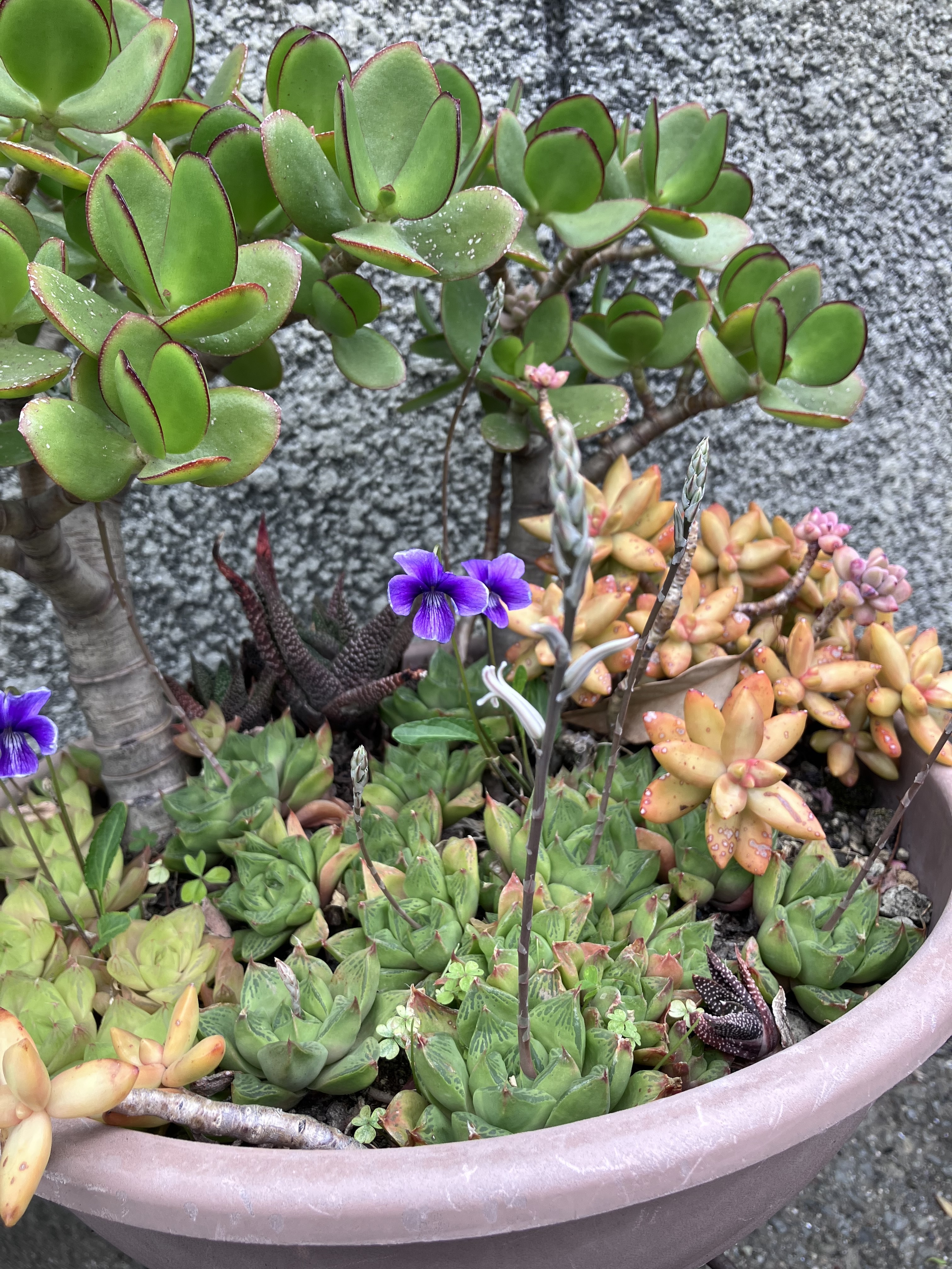 色々多肉を適当に寄せ植えしたら詰め詰めになってしまい、そこに野生の菫が同居してきてKHAOS😅