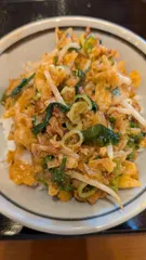 旨辛肉盛りニラ玉ぶっかけ③ ニンニクも加え一通り食べたあと別碗の天かすとわかめを入れてみる🤩天かすのカリカリと入ってたモヤシの食感もいい👍わかめもいい😄何より食べ応え充分
