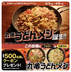 うどんとごはんをソースで焼いたッ?キャンペーン5日目🔥✨ 丸亀製麺のX公式アカウントの「うどんとごはんをソースで焼いたッ?キャンペーン」、5日目がはじまりました。応募方法は簡単。@UdonMarugameをフォローし、該当の投稿をリポストするだけです。抽選で500名に、500円引きクーポンが当たります。5日目の応募期限は4/8(水)13:59まで!ぜひ、応