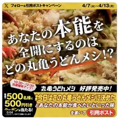 今日はこの丸亀うどんメシに決めたキャンペーン 丸亀製麺のX公式アカウントで、「今日はこの丸亀うどんメシに決めたキャンペーン」がはじまりました。参加方法は・・・①@UdonMarugameをフォロー②#今日はこの丸亀うどんメシに決めた をつけ、うどんメシの4つの味から、あなたの本能が食べたいといった味を書いて、該当の投稿を引用ポストします。抽選で