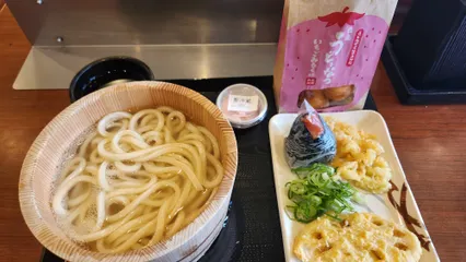 釜揚げうどんに明太子おにぎりに レンコンの天ぷらも美味しい😅🥢 いちごみるくうどーなつ美味しい😋🍓