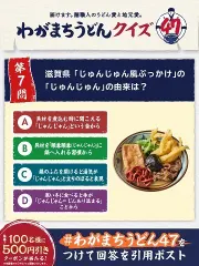 わがまちうどん47クイズ 7問目 Xの公式アカウントに、「わがまちうどん47 クイズ 」の7問目が投稿されています。わがまちうどん47 に使える500円引クーポンが抽選で100名様に当たるそうです。7問目は、滋賀県のわがまちに関する問題です。