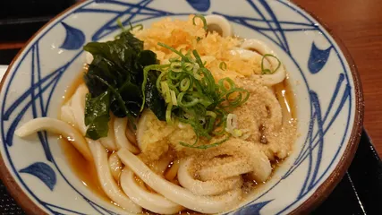 5日ぶりの冷やぶっかけ! やっと丸ちゃん詣でして、冷や麺を食べることができました。わかめ・天かす・ネギ・生姜・ゴマの無料トッピングで満足の昼食です☺️サイドメニューはエビホタテかき揚げにしました。