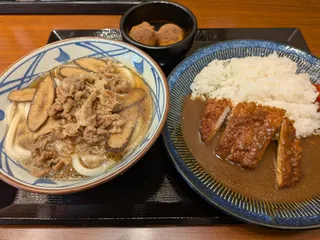 ワクワクいっぱい、久留米国分店🍜 本日の丸亀製麺は、肉ごぼううどん+カツカレー+うどーなつ2個!そんなのあるの??ばかりのメニューですが、ここにはあるんです。それが、久留米国分店のまんきつ定食🙆肉ごほううどん+ご飯もの+うどーなつ2個で870円と、内容に対して破格なセットになっております。ボリューム満点でお腹がはち切れそうでしたが、