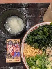 冷ぶっかけ小・元気玉おむすびを注文しました🥢情報提供で元気玉おむすびが天ぷらクーポン使えました😙うどん札スーパーサイヤ人悟飯・クリリン😐とりあえず冷ぶっかけ小にしてコストを抑えました。一応小どんぶりにのせてサイズ感はこんな感じです(たぶんカレーうどんに投入する食べ方が一番美味しいかな🤔)元気玉おむす
