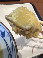 焼きいも天ぷら 初めて見かけた焼きいも天。芋好きなので見逃せなくて注文してみました。中がホクホクで衣のうまみもあいまって、お塩かけて食べたら最高に甘い!今の時期限定のお楽しみですね😊
