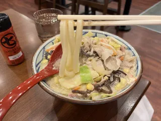 優れたうどん───それは麺厚が4.8、釜の温度がしっかりと100℃越え、最適な水温で直ぐに麺上げ、麺締めを行い生まれたての生き生きとしている全てがパーフェクトな豚ちゃんぽんうどんが、こちらです。