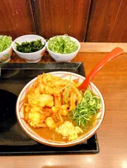 カレーうどん並・🌽🧀のかき揚げ カレーうどん並・🌽🧀のかき揚げを注文しました🥢いつも通りカレー・うどんそれぞれどんぶりを分けて貰いかけうどんとカレーうどんを作りました😙カレーうどんに🌽🧀かき揚げをトッピングして🐢ネギ・生姜を入れました😀かき揚げをほぐして🌽🧀玉ねぎがカレーに混ざり具沢山カレーうどんになりました🤤(この🌽🧀かき揚げは