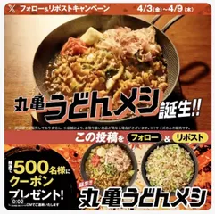うどんとごはんをソースで焼いたッ?キャンペーン2日目🔥✨ 丸亀製麺のX公式アカウントの「うどんとごはんをソースで焼いたッ?キャンペーン」、2日目がはじまりました。応募方法は簡単。@UdonMarugameをフォローし、該当の投稿をリポストするだけです。抽選で500名に、500円引きクーポンが当たります。2日目の応募期限は4/5(日)13:59まで!応募しな