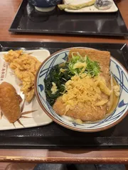 お帰りなさーい🙇 先ずは出汁サーバーで駆け付け3杯🥃 帰国一杯目は、丸亀製麺のいろはのいの字の釜揚げうどんからてすね😀