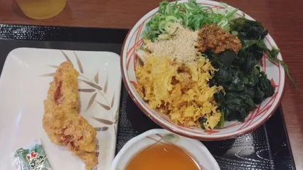 5日ぶりの冷やぶっかけ! やっと丸ちゃん詣でして、冷や麺を食べることができました。わかめ・天かす・ネギ・生姜・ゴマの無料トッピングで満足の昼食です☺️サイドメニューはエビホタテかき揚げにしました。